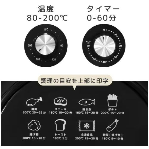 操作方法は温度(80〜200℃)とタイマー(0〜60分)をダイヤルで回すだけ。
