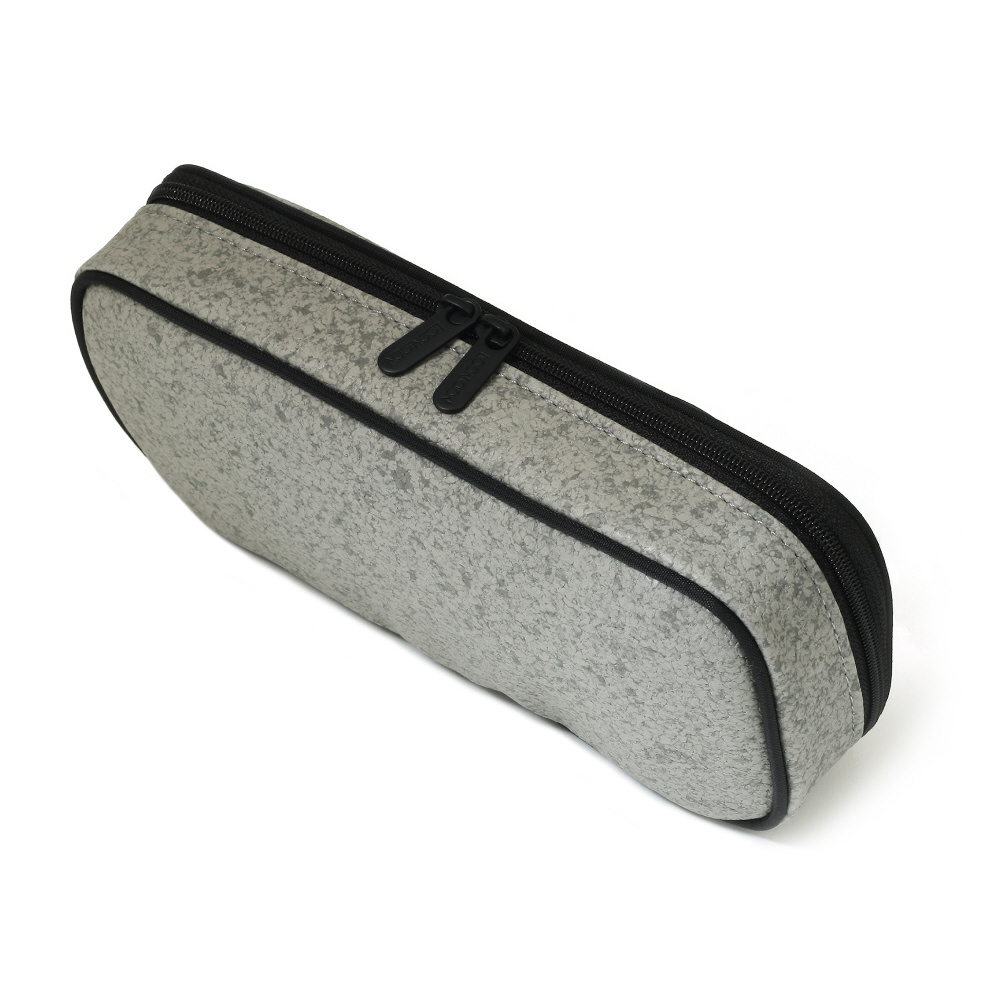 663は名前のとおりストーン(大理石)をモチーフにデザインされた製品です。ストーンをモチーフとした製品ですが、ユニークで手触りの良い生地を使用し、滑らかな質感を実現しました。大容量でありながら無駄のないすっきりとしたデザインと、ブラックラインになじむ黒の斜線ロゴがポイントです。使いやすく仕切られた直感的な収納構造の2階建てペンケースなので、必要な筆記用具を素早く簡単に仕分けることができます。
