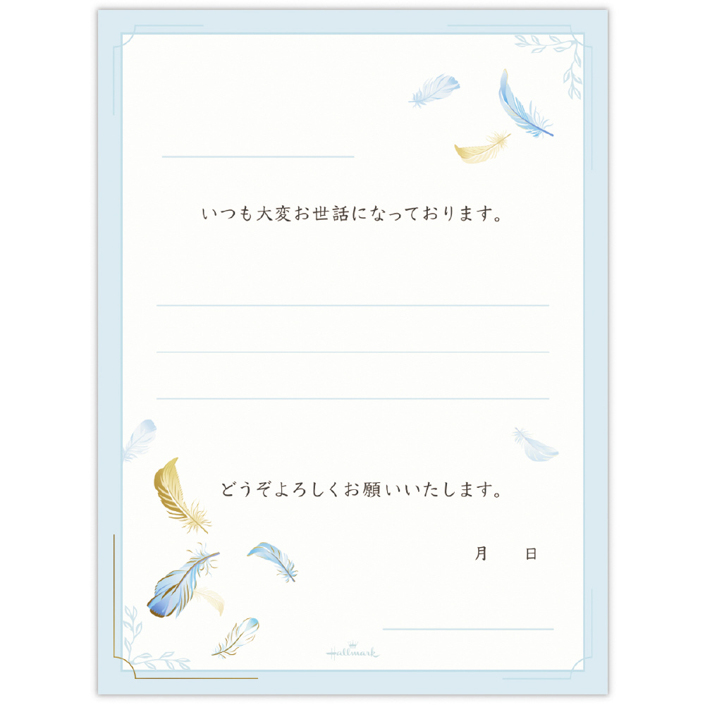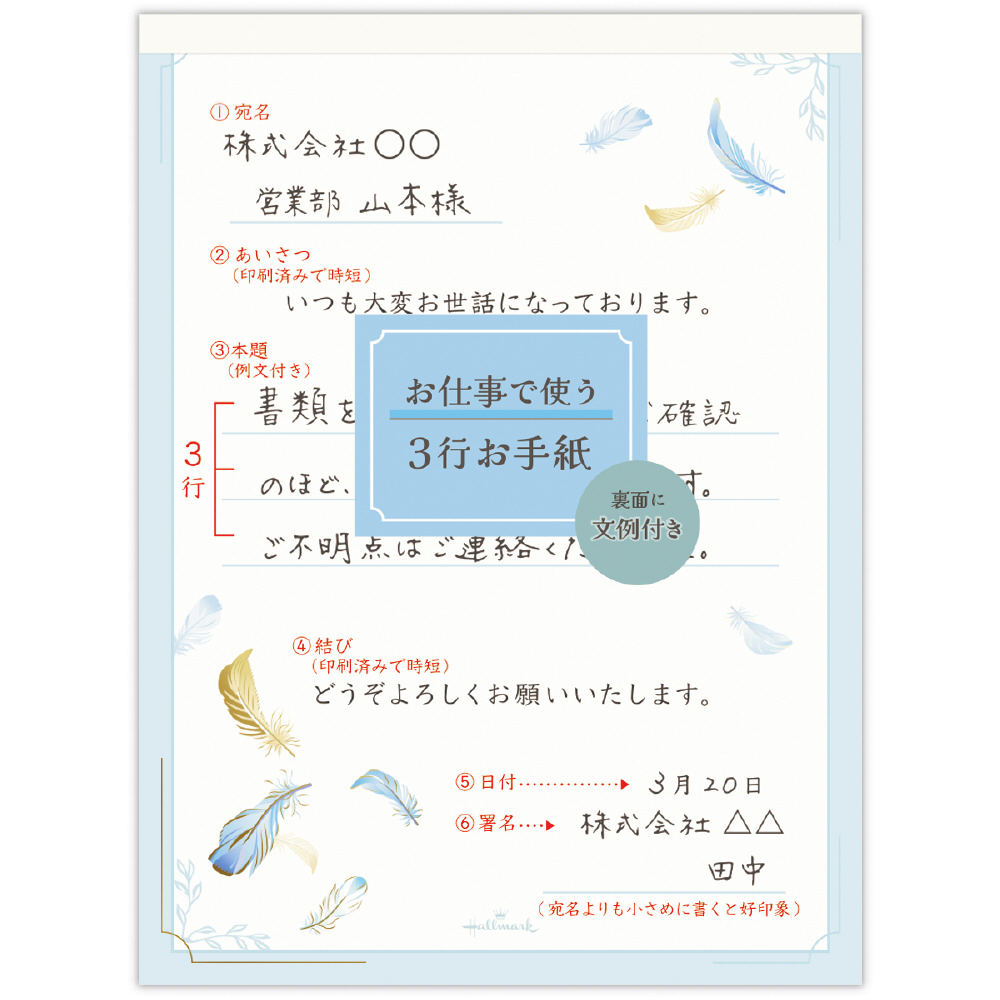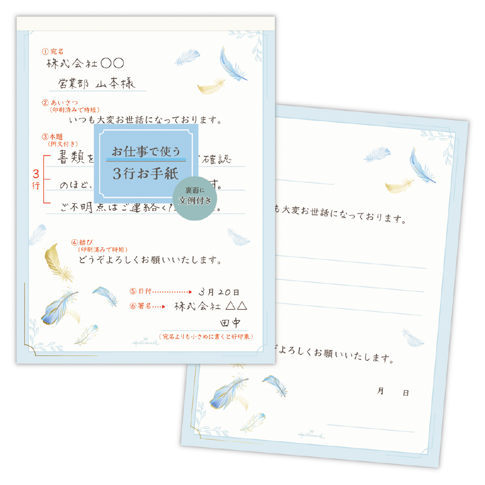 手書きの文章を3行加えるだけで、丁寧な手紙が完成する文例付きレター。手書きのぬくもりが加わることで、味気ないパソコンで書かれたタイプ文字がぐっとグレードアップ。シチュエーション別の文例を豊富にご用意しているので場面に応じた活用も可能です。お相手を問わず贈りやすい羽根のデザイン。