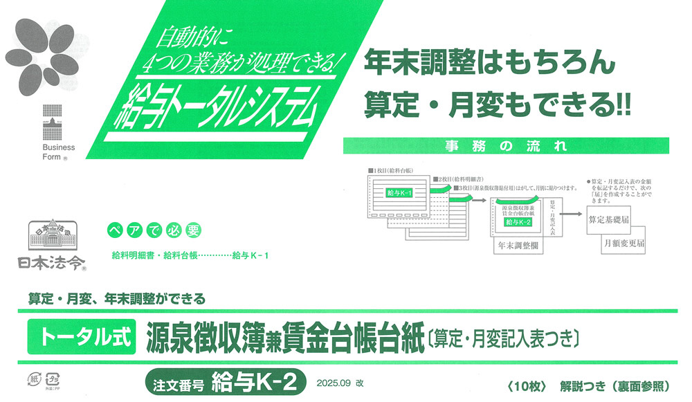 本商品は毎月の給料計算はもちろん、年末調整、社会保険の算定・月変の計算までができるよう工夫された給料計算用紙システムです。別売りの給与K-1:トータル式給料明細書・給料台帳で作成し社員個人ごとの給与明細部分(3枚目)をそのまま貼り付けることで、個人ごとの源泉徴収簿兼賃金台帳を作成することができます。