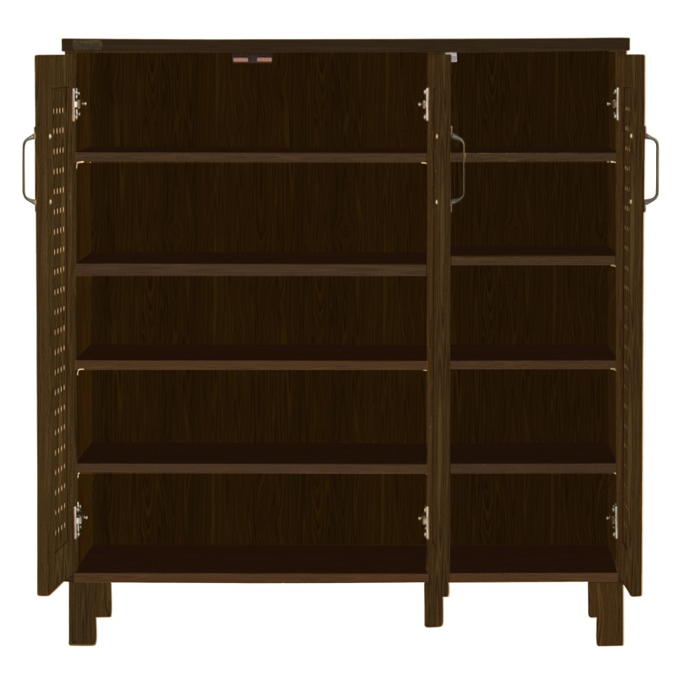 扉内には大きい移動棚が4枚と小さい移動棚が4枚あり、靴の高さに合わせて簡単に棚の高さを変える事が出来ます。