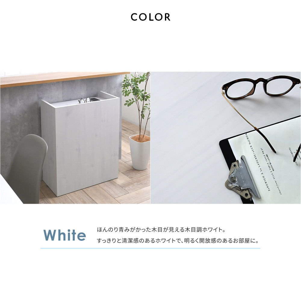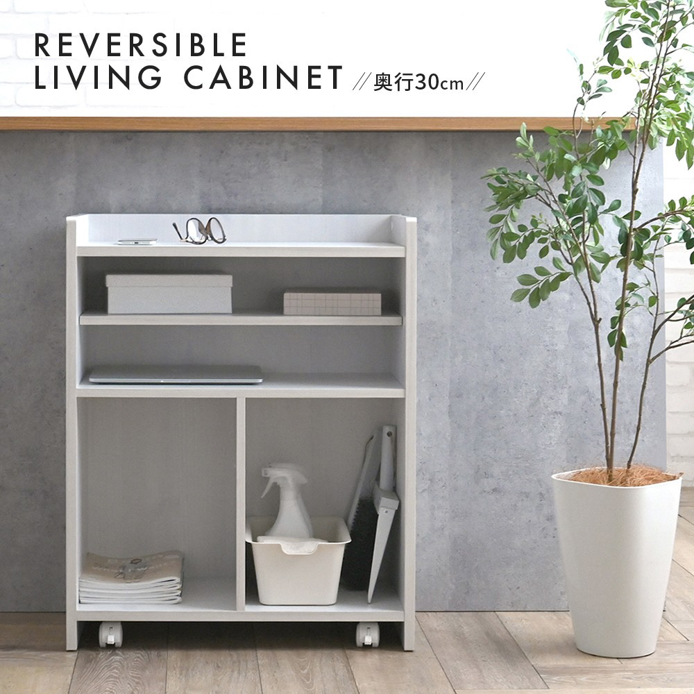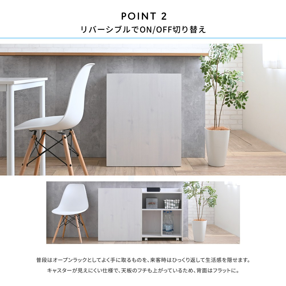 オープン部を壁付けて生活感を隠せるリバーシブル仕様。天板に置いたものもすっきり隠せるデザイン。木目調の美しい背面は間仕切りとしても活躍。