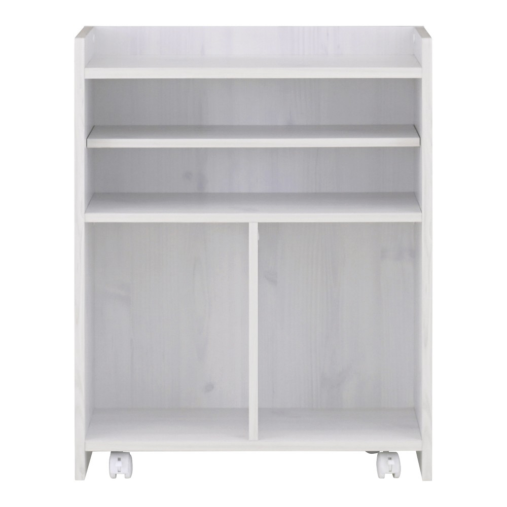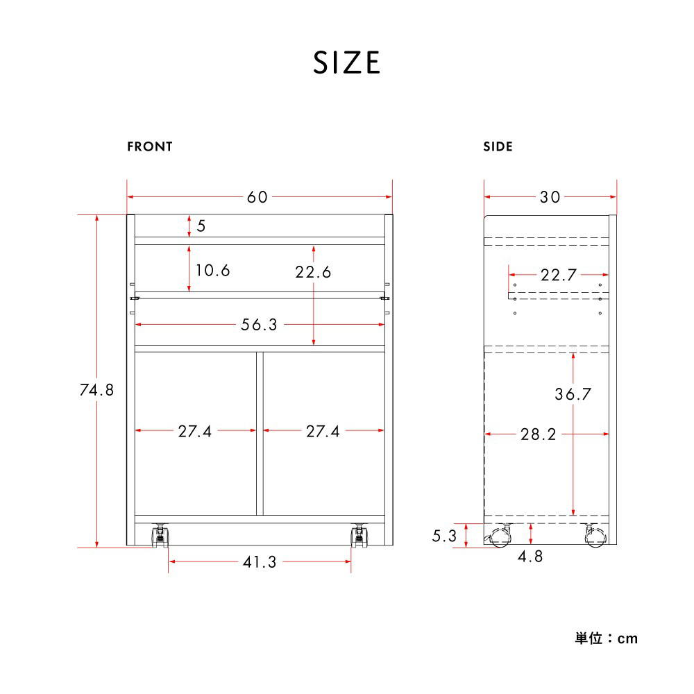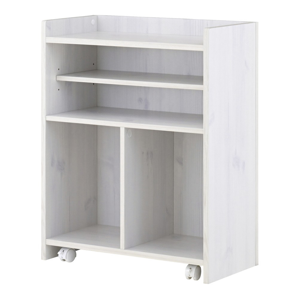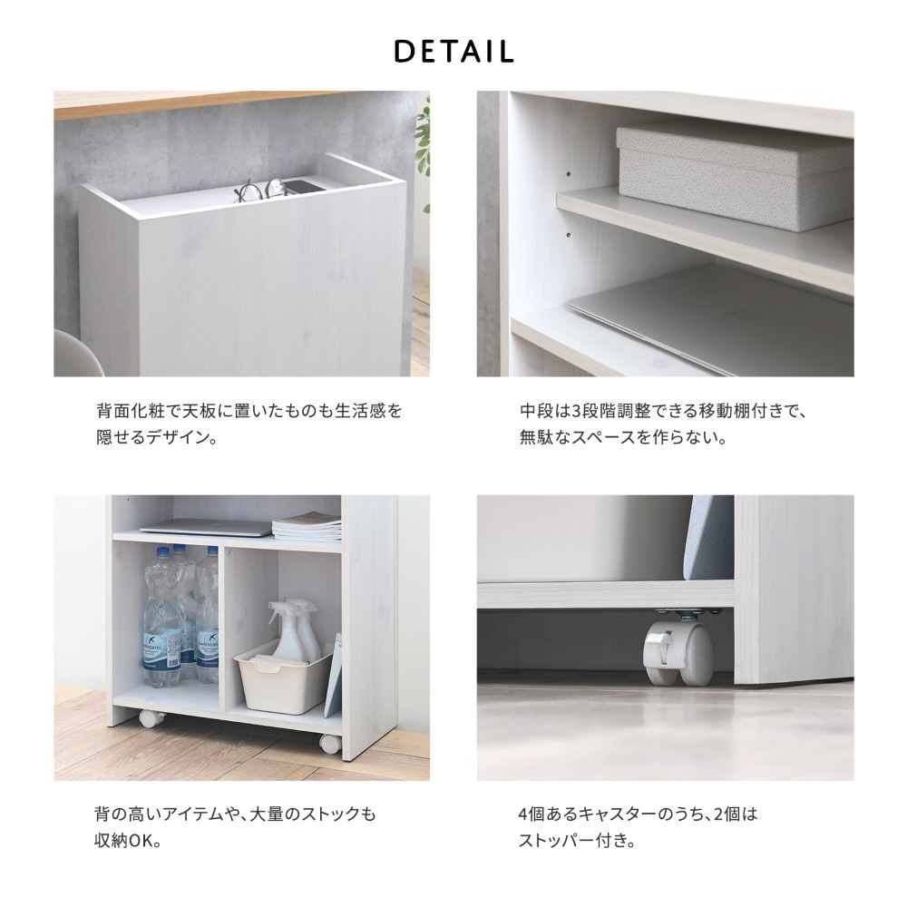 裏返して生活感を隠せるリバーシブル仕様の大容量オープンラック。隠しキャスター付ですっきりと収納できるカウンター下収納です。生活雑貨やA4ファイル、背の高いアイテムなども収納することができます。木目調がきれいな背面化粧になっているので、間仕切り家具としても使うことができます。