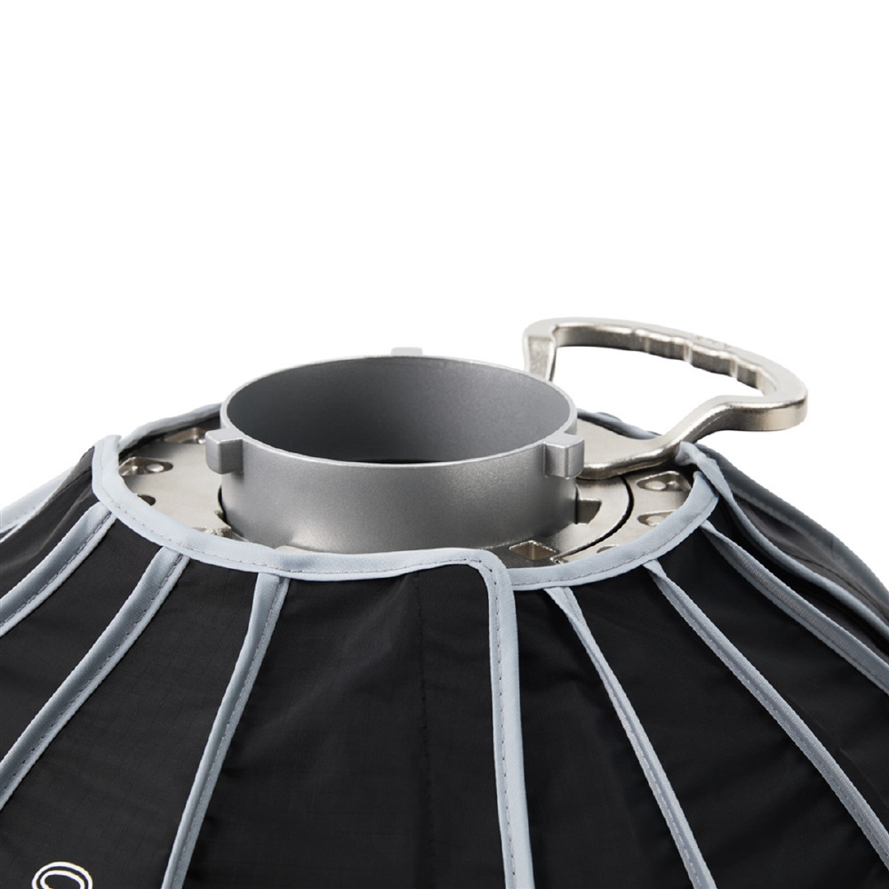 側面の拡張ハンドルは取り付け・取り外し時の操作性を高め、スナップ式の着脱可能なBowens/Mini ProLockマウントチャックによりパーツ交換も容易です。