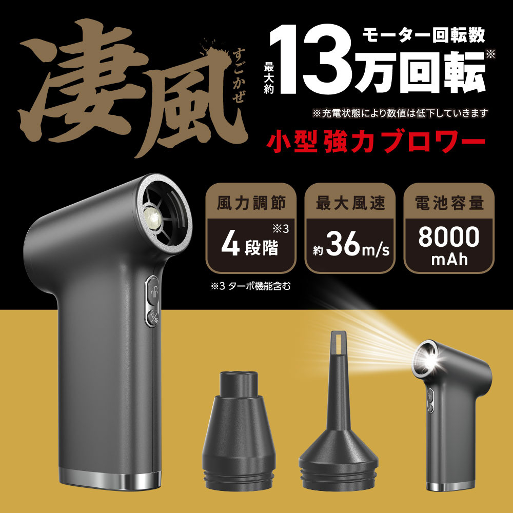 最大約13万回転/分の強力なブラシレスモーターから最大風速約36m/sの風速で効率的に作業ができます