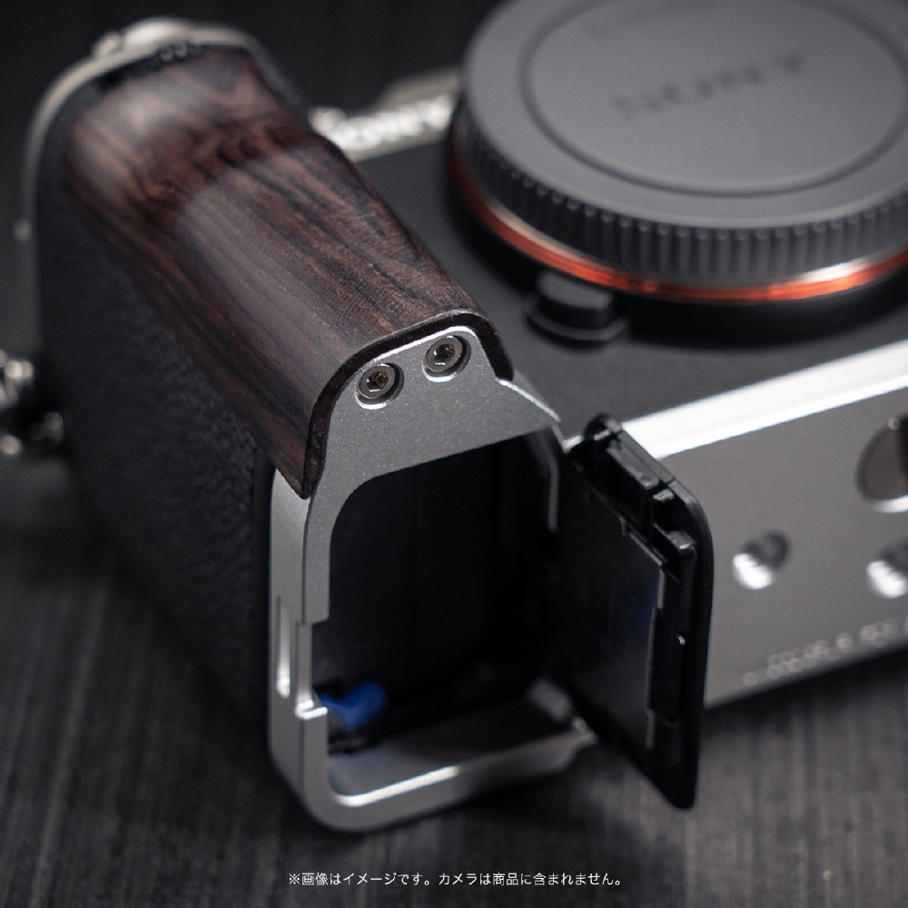 本製品シリーズのカメラグリップは、対応するカメラボディ専用に設計されたモデルです。カメラ形状に合わせた専用設計により、装着時のフィット感に優れ、カメラ本来の操作性やデザインを損なうことなく、安心してご使用いただけます。装着したままバッテリーおよびメモリーカードの交換が可能で、撮影中の取り回しもスムーズです。底面にはアルカスイス互換規格を採用しており、対応する雲台へ素早く装着でき、快適な撮影環境を実現します。さらに、プレート部にはストラップホールを備え、縦位置・横位置のいずれの撮影スタイルにも柔軟に対応します。グリップ部には天然木を使用し、手に馴染みやすく、長時間の撮影でも快適なホールド感を提供。ホールド性を高めることで手ブレを抑え、安定した撮影をサポートします。使い込むほどに質感や光沢が深まり、天然素材ならではの経年変化をお楽しみいただけます。