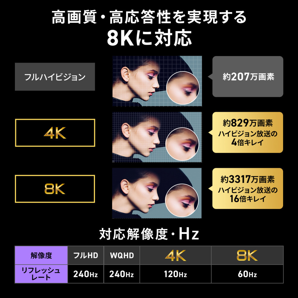 ●高帯域幅(48Gbps)で8K映像や4K/120Hzに対応で高画質・高応答性の映像体験を実現します。
