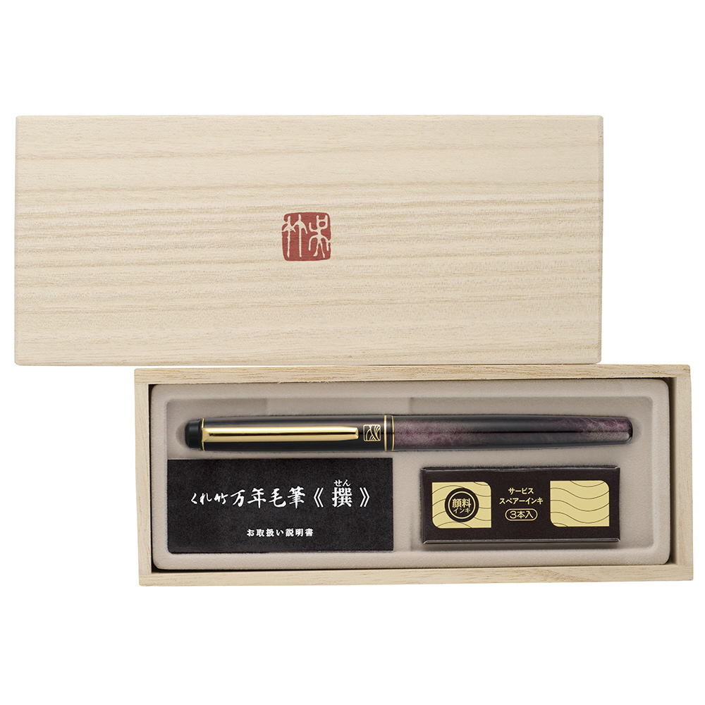 べっこう調が美しい高級感のあるデザイン。先がよくきき、まとまりが良い穂先のため、毛筆に慣れ親しんだ方にもご満足いただけます。いたち毛と変わらぬ書き味の特殊ポリエステル毛材を、熟練の筆匠が一本一本丹念に造筆。贈答にも最適な桐箱入り。
