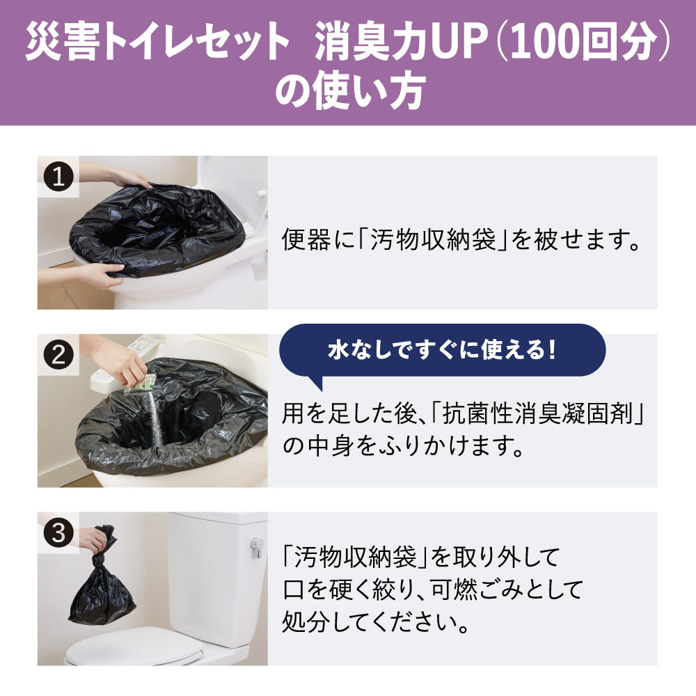 断水時のトイレ問題を解決する100回分の簡易トイレセットです。抗菌性凝固剤に消臭剤を追加し、当社従来品に比べ消臭効果を高めました。