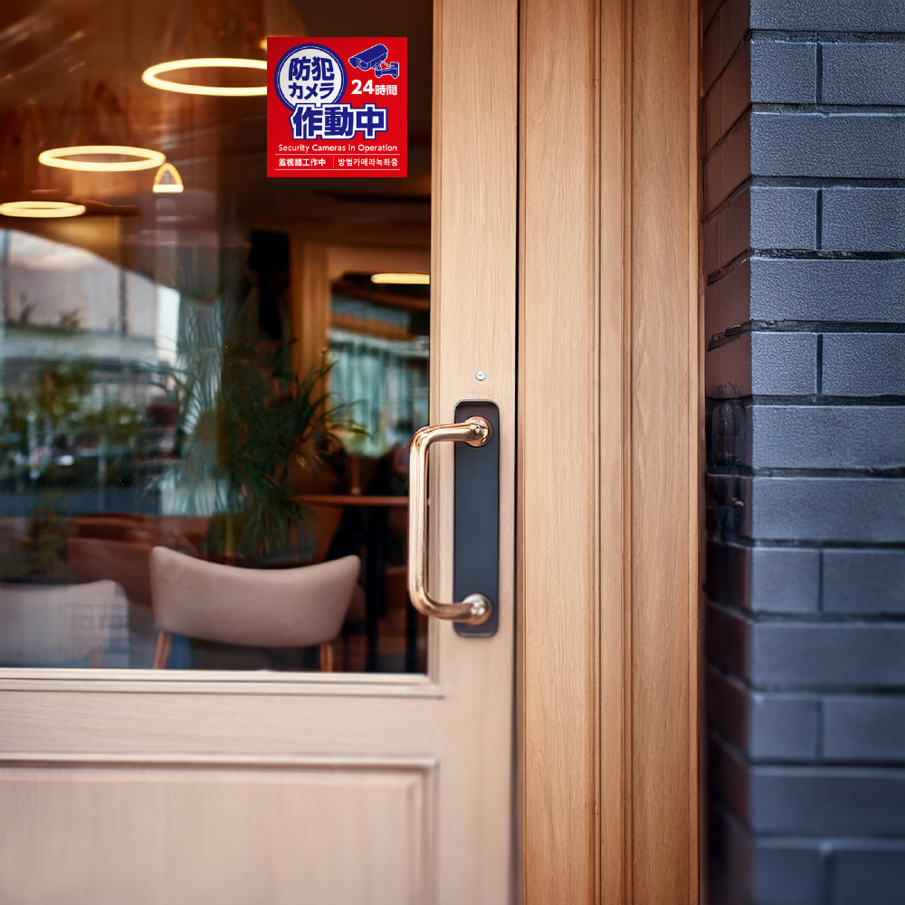防犯効果をぐっと高める、防犯カメラ作動中ステッカーです。お店の入口や壁面に貼るだけで簡単に注意喚起ができます。防水加工済みで雨の日でも剥がれにくく、直射日光にも強い耐光インキを使用しているため、屋外でも長くご利用いただけます。また、このステッカーには英語、韓国語、中国語でも記載があり、異なる言語や文化を持つ方々にも伝わりやすく、多様な環境で効果的に注意を促すことができます。防犯対策の第一歩として、取り入れやすいステッカーです。