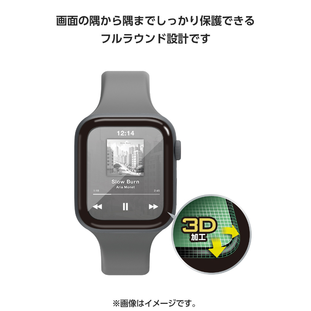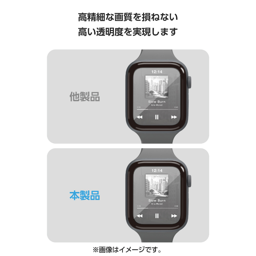 高硬度10Hの強化ガラスを採用し、画面の美しさを損ねずに傷や汚れから保護する、高透明・指紋防止タイプのApple Watch用フルカバーガラスフィルムです。