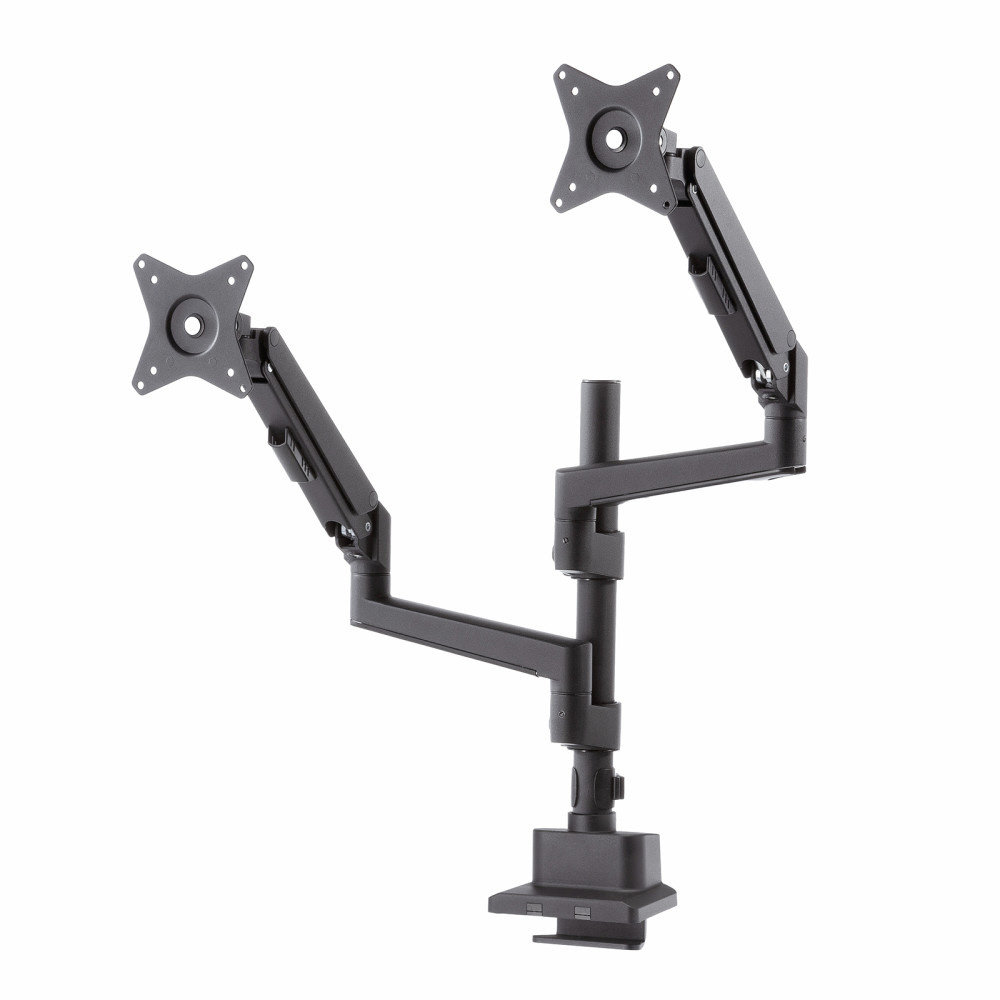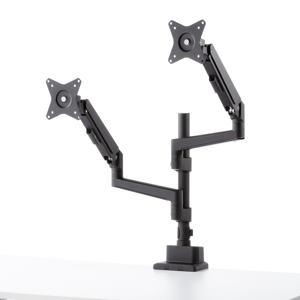 わずか奥行き38mmの薄型ショートクランプタイプのデュアルモニターアーム。支柱タイプで幅広い高さ調節が可能。ガススプリング式。