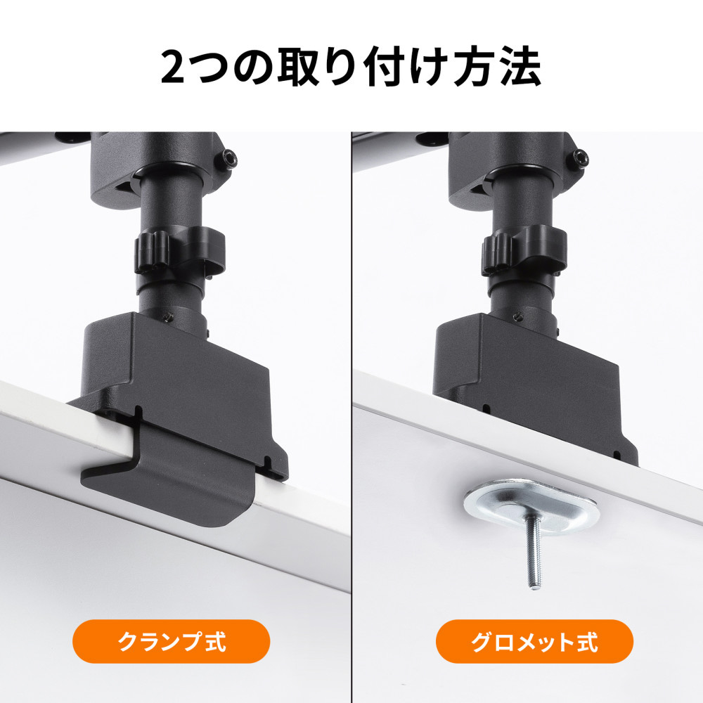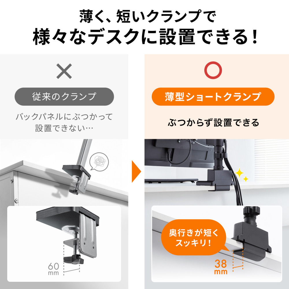 ■クランプ金具の奥行きがわずか38mmの薄型ショートクランプタイプなので、バックパネルのあるデスクにも取り付けしやすくなっています。