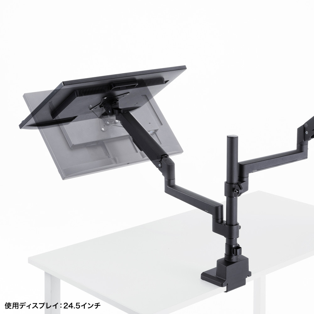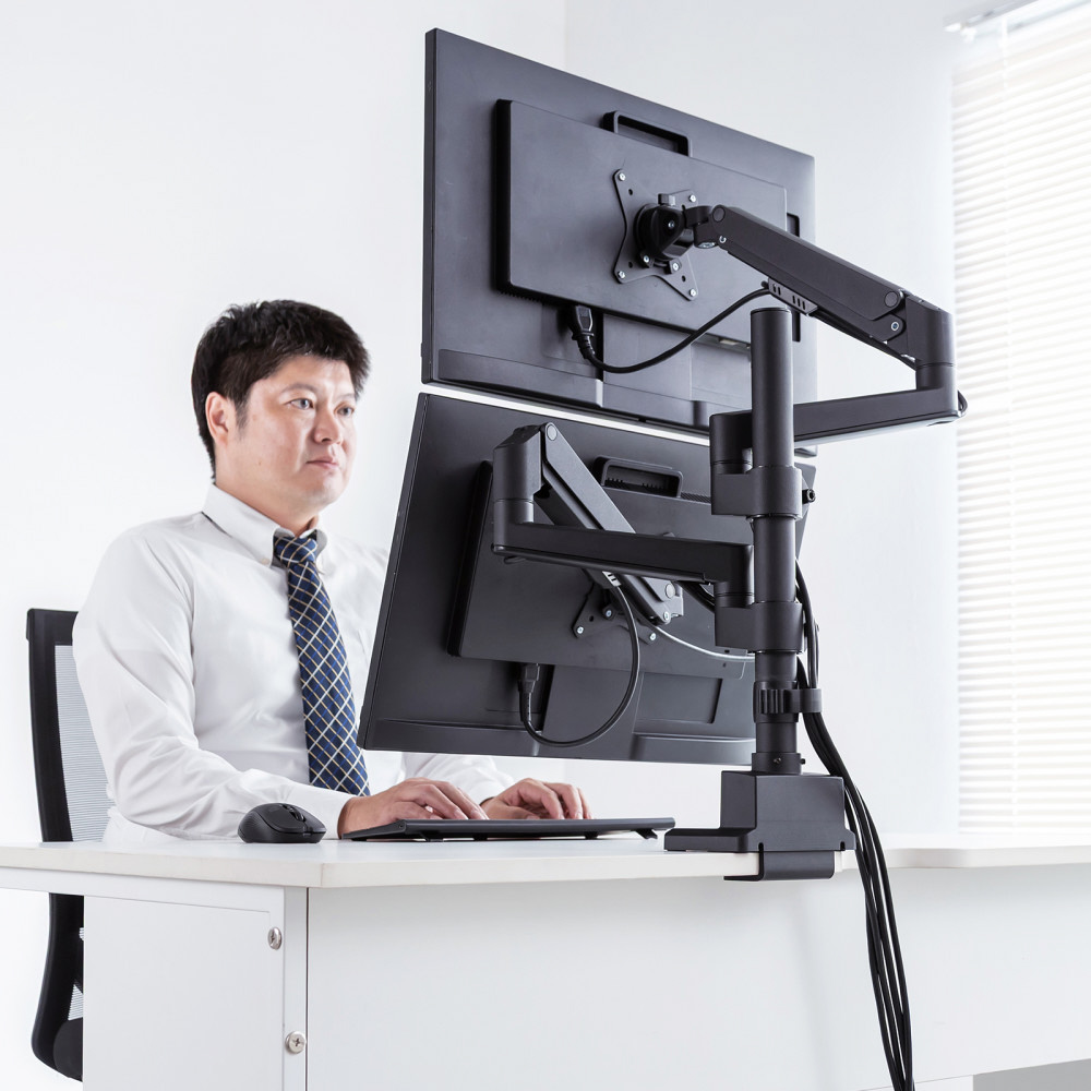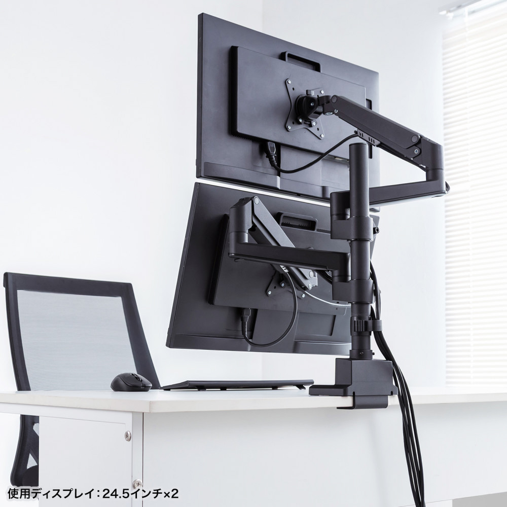 ■支柱にガススプリング式アームを取り付けるタイプなので、高さ調整の自由度が高く、通常のガススプリング式モニターアームに比べ、より高い位置にモニターを設置できたり、2画面を上下左右に自由に位置調整できたりします。