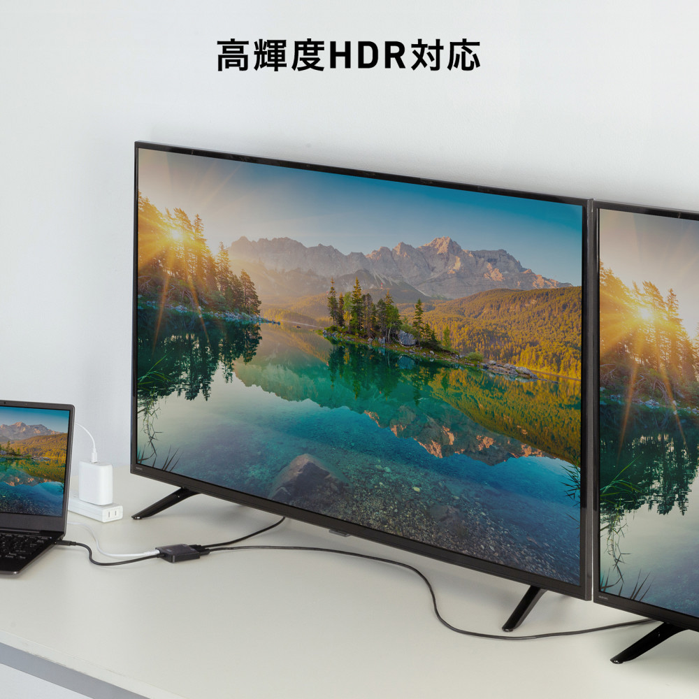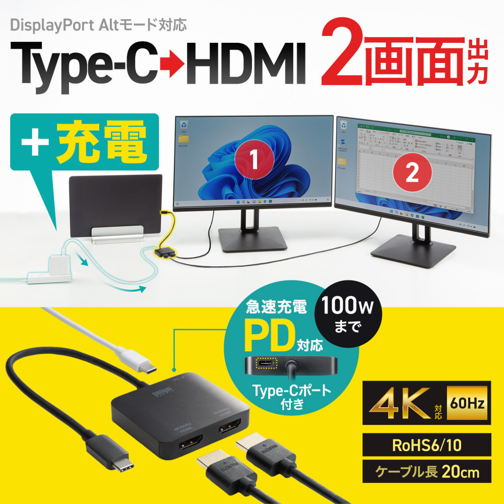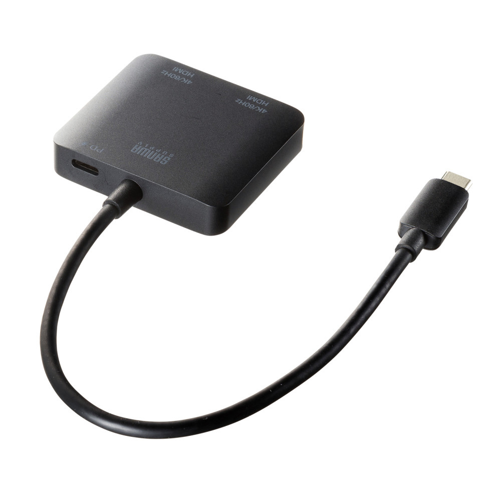 Type-CポートからHDMI×2ポートに分配/拡張して映像出力ができる4K対応変換アダプタ。PD対応で充電しながらの長時間映像出力が可能。