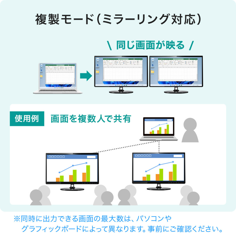 ■2台のディスプレイへの複製出力に対応しておりノートパソコンの画面を含めた場合、最大3画面に同じ画面出力(4K/60Hz×2+ノートPC画面)が可能です。