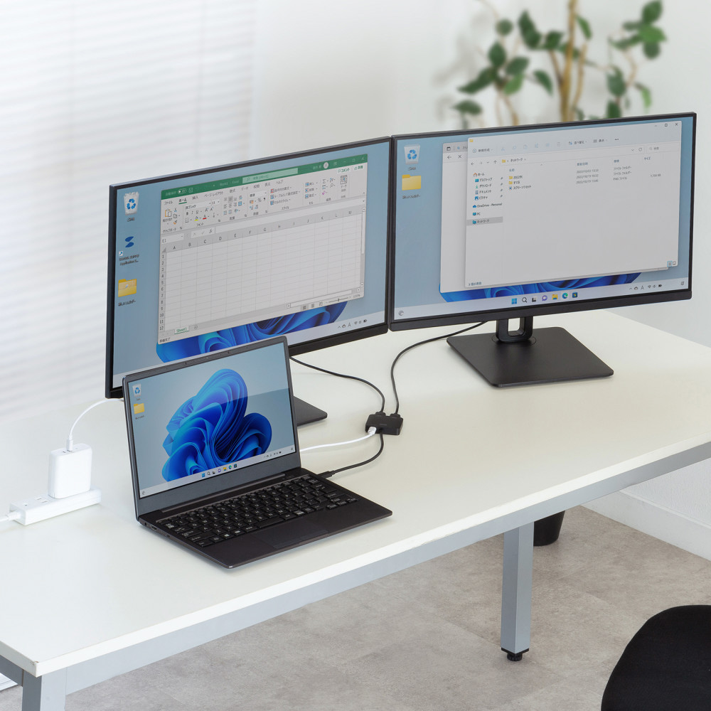 ■2台のディスプレイへの拡張出力に対応しておりノートパソコンの画面を含めた場合、最大3画面への拡張出力(4K/60Hz×2+ノートPC画面)が可能です。