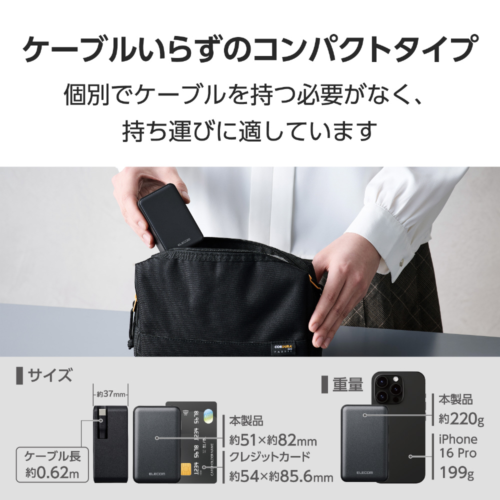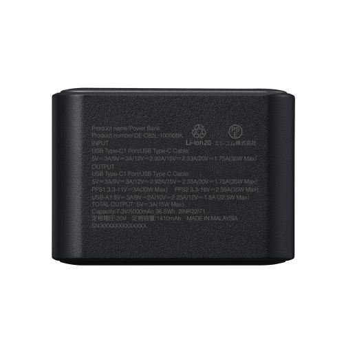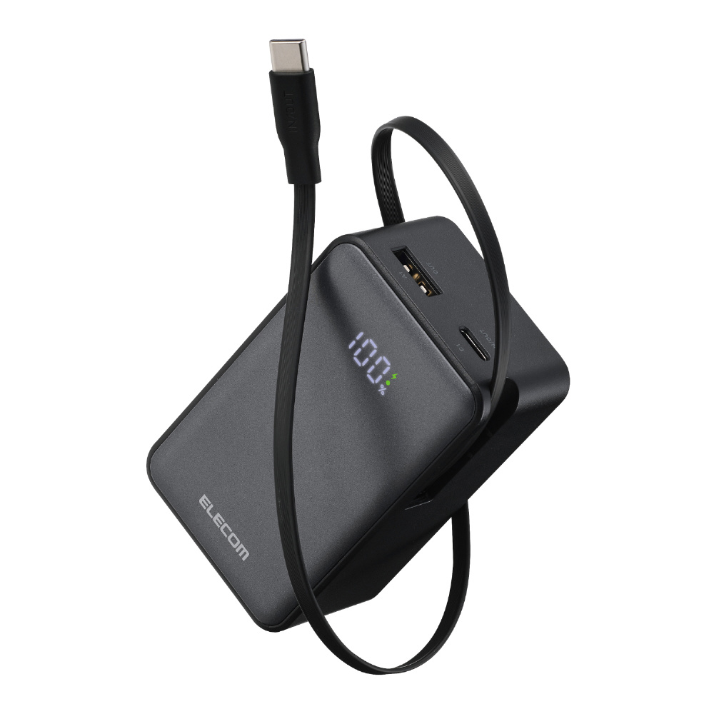モバイルバッテリー リチウムイオン電池 巻取リ式ケーブル一体 残量表示 35W 10000mAh USB-Cケーブル USB-C USB-A DE-C82L-10000BK
