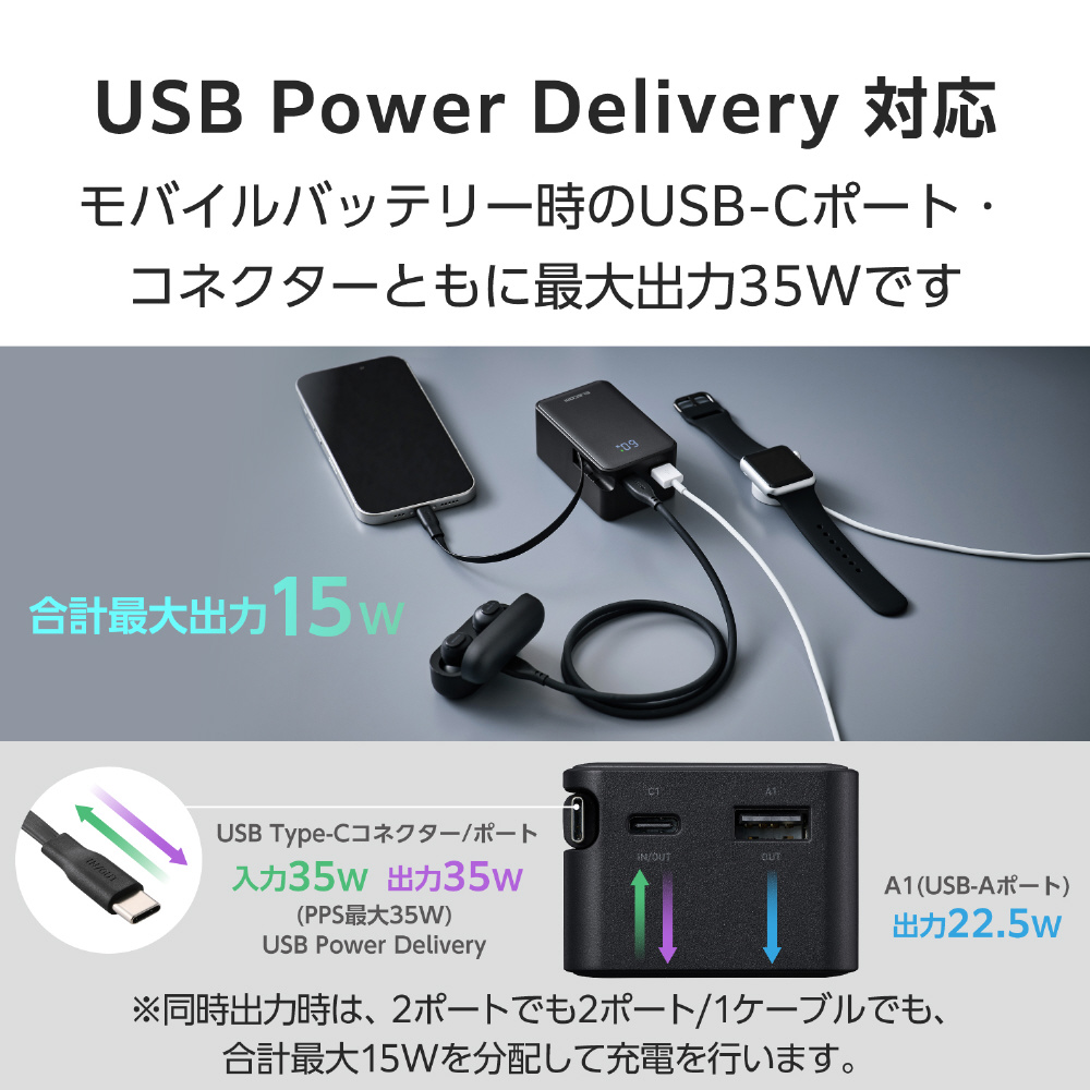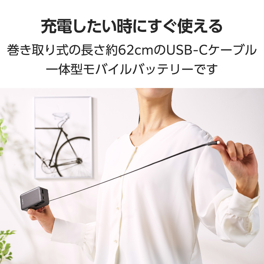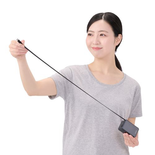 スッと伸ばして、くるっと収納!持ち運びに便利な本体一体型の巻き取り式USB Type-C(TM)ケーブルを備えたモバイルバッテリーです。最大出力35Wなので、スマートフォンやタブレットはもちろん、ノートパソコンの充電も可能。容量10000mAhで外出先でも安心して充電できます。ケーブルを持ち忘れる心配がなく、必要な長さに調節して使用できます。