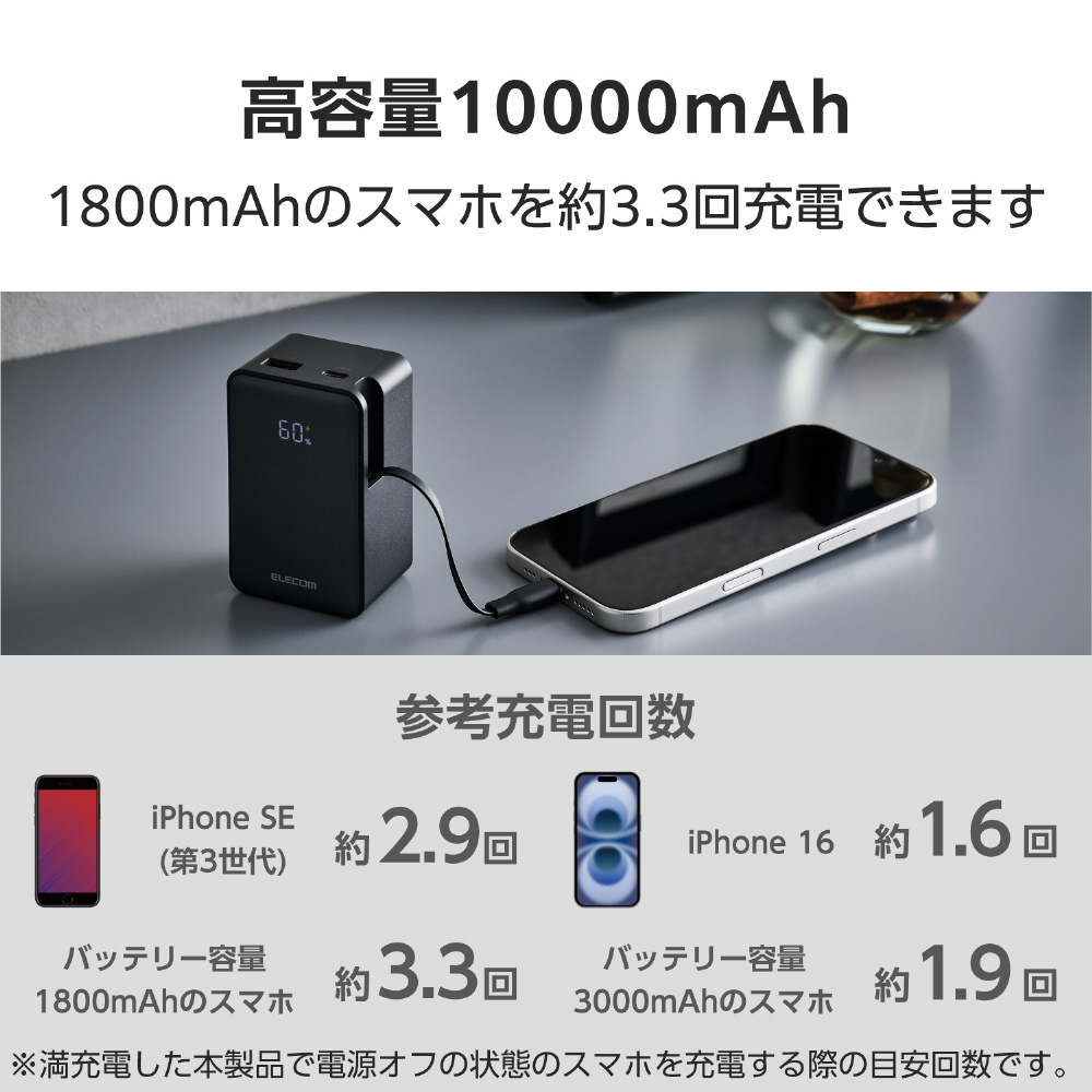 本製品(バッテリー容量10000mAh)で、1800mAhのスマートフォンを約3.3回、3000mAhのスマートフォンを約1.9回充電可能です。