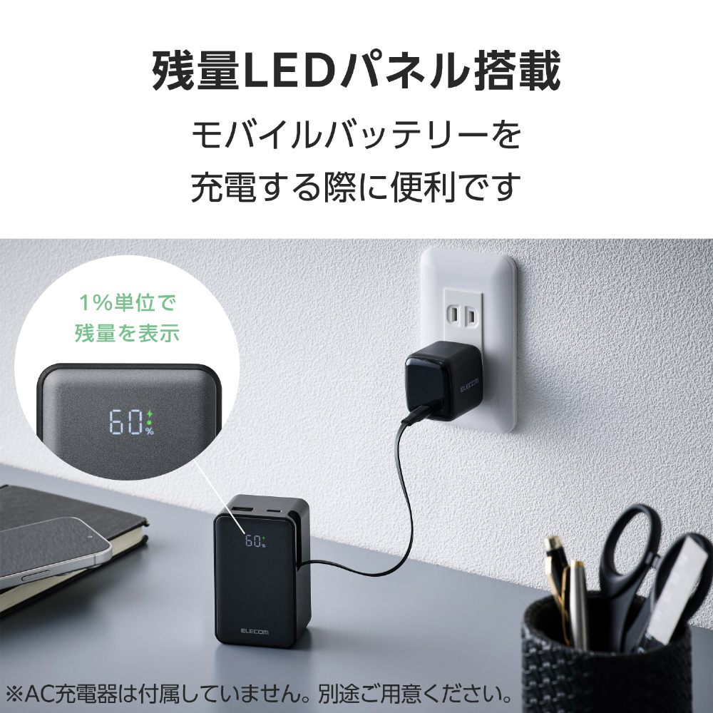 LEDパネルでバッテリー残量を1%単位で確認しながら使えます。事前にモバイルバッテリーを充電する際などに便利です。