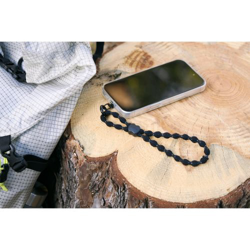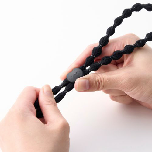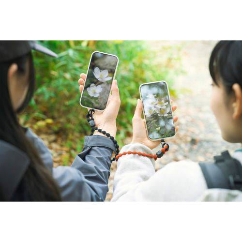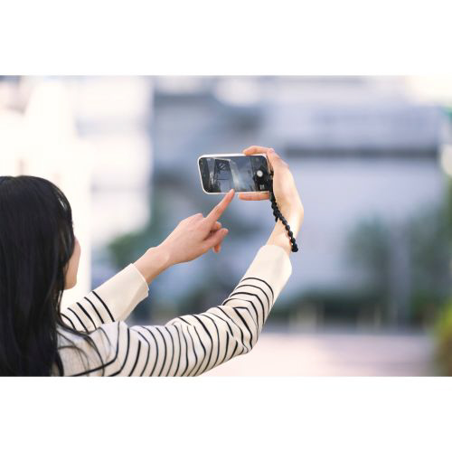 ひもは柔らかく伸縮し、手首に掛けたままでも写真撮影や電子決済をスムーズに行えます。