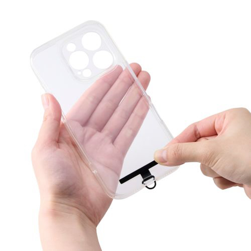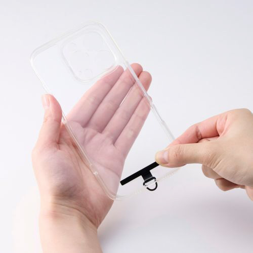 ケースにフィットする0.2mmの薄型ストラップホールシートを付属。ケースにストラップホールがなくても、スマートフォンとケースの間に挟むだけで使用できます。