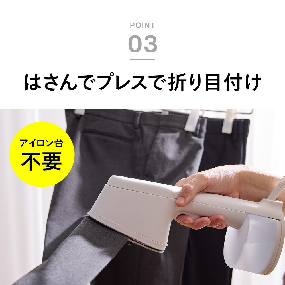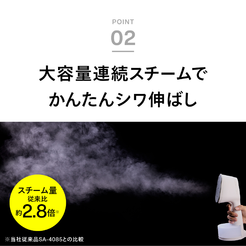 はさめる衣類スチーマー SA-4098Wは、スチーム・アイロン・はさんでプレスが行える1台3役の多機能衣類スチーマーです。約20g/分のたっぷりスチームでシワやニオイもさっとケアします。はさんでプレスができるからアイロン台不要でズボンの折り目がつけられるので手軽に美しく仕上げます。