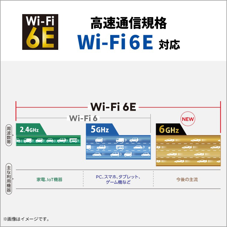 Wi-Fi 6E(2.4Gbps)対応、IEEE 802.11ax/ac/a/b/g/n準拠、MU-MIMO対応