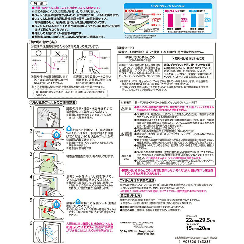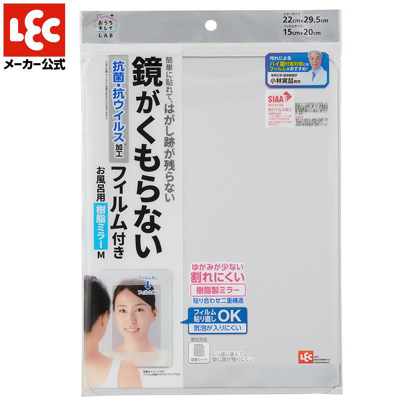 抗菌・抗ウイルス加工のくもり止めフィルム付きです。※全ての菌・ウイルスに効果があるわけではありません。フィルム表面の親水性が高いため、水が膜状になり、くもりを防ぎます。フィルム粘着面は自己粘着性樹脂を使用した再剥離タイプ。糊不使用のため、貼り付け面にはがし跡が残りにくいです。フィルムを貼る時にごくわずかな気泡が入っても、数日経つと空気が抜けて目立たなくなります落としても割れにくい樹脂製の鏡です。
