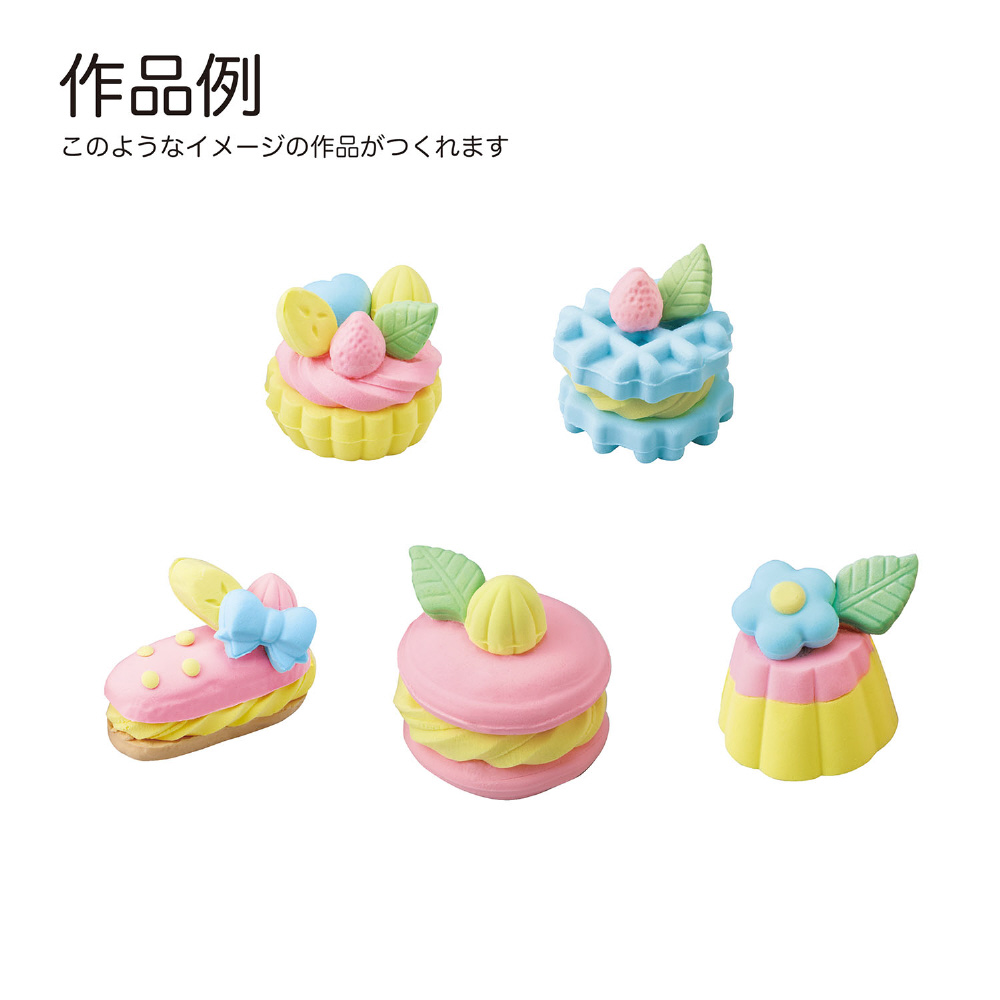 ふわふわムースねんどでかわいい5種類のスイーツが作れるよ。やわらかくて取り出しやすい立体ねんど型付。パステル3色のねんど入。