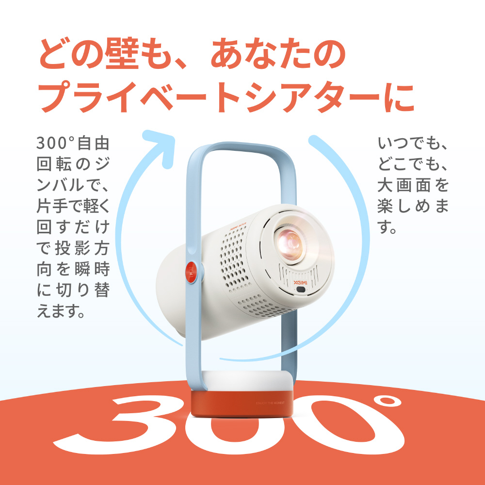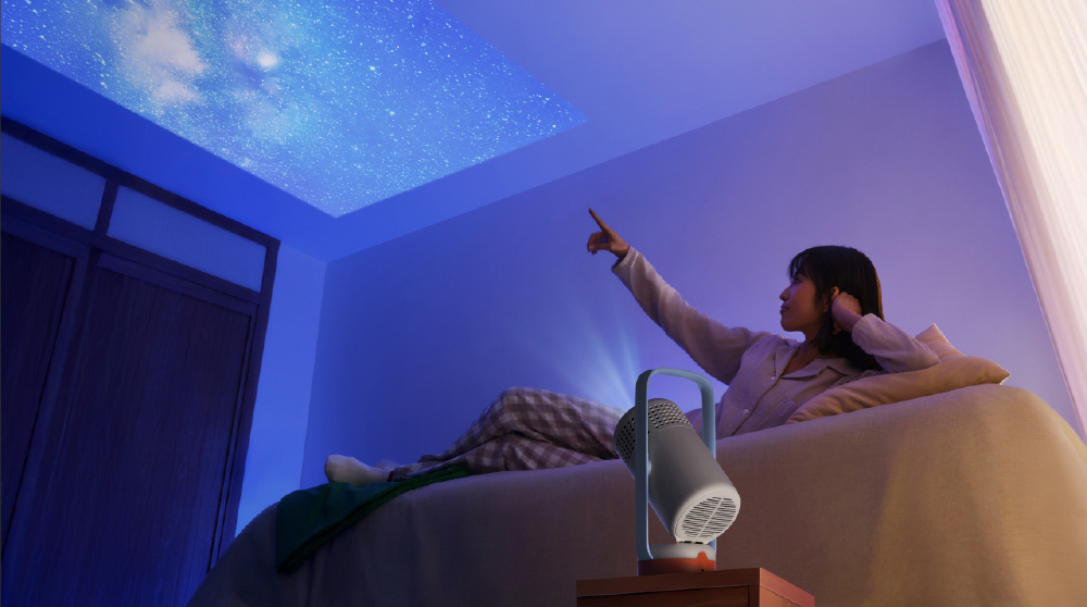 本体一体型の300°回転スタンドにより、壁投影はもちろん、ベッドで寝転びながらの天井投影にも対応。