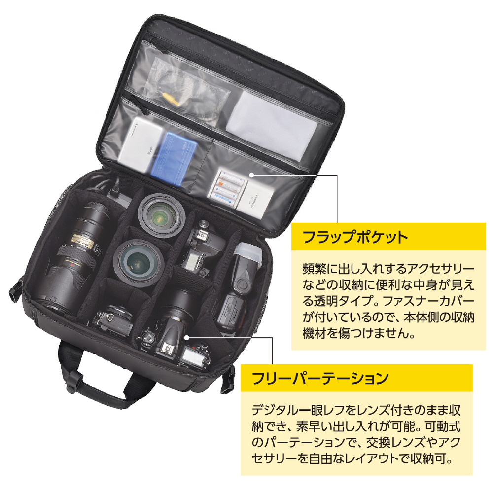 【フラップポケット】頻繁に出し入れするアクセサリーなどの収納に便利な中身が見える透明タイプ。本体側の機材を傷つけないファスナーカバー付き。