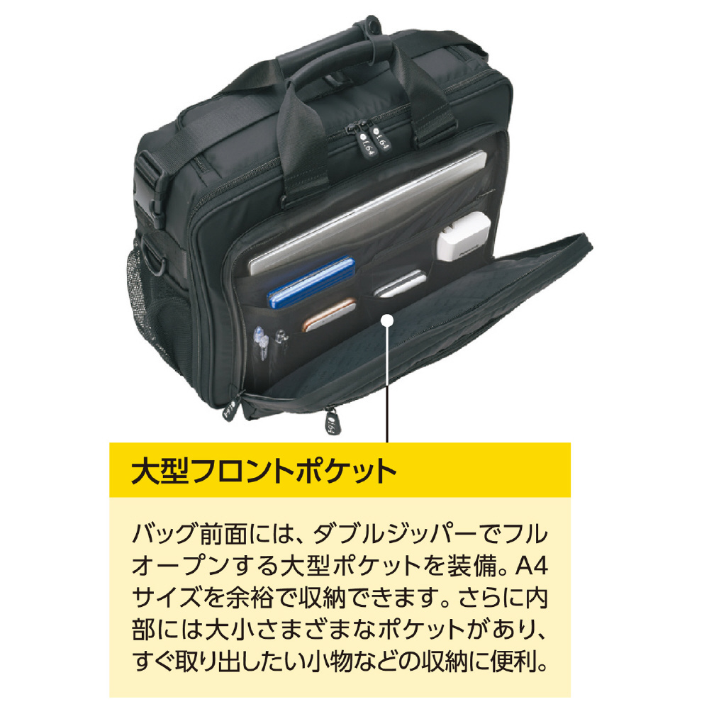 【フロントポケット】ダブルファスナーで大きく開くフロントポケットを装備。A4サイズが十分に入れられるスペースとタブレット用ポケット。さらに大小さまざまなポケットでアクセサリーや小物が整理して収納できます。