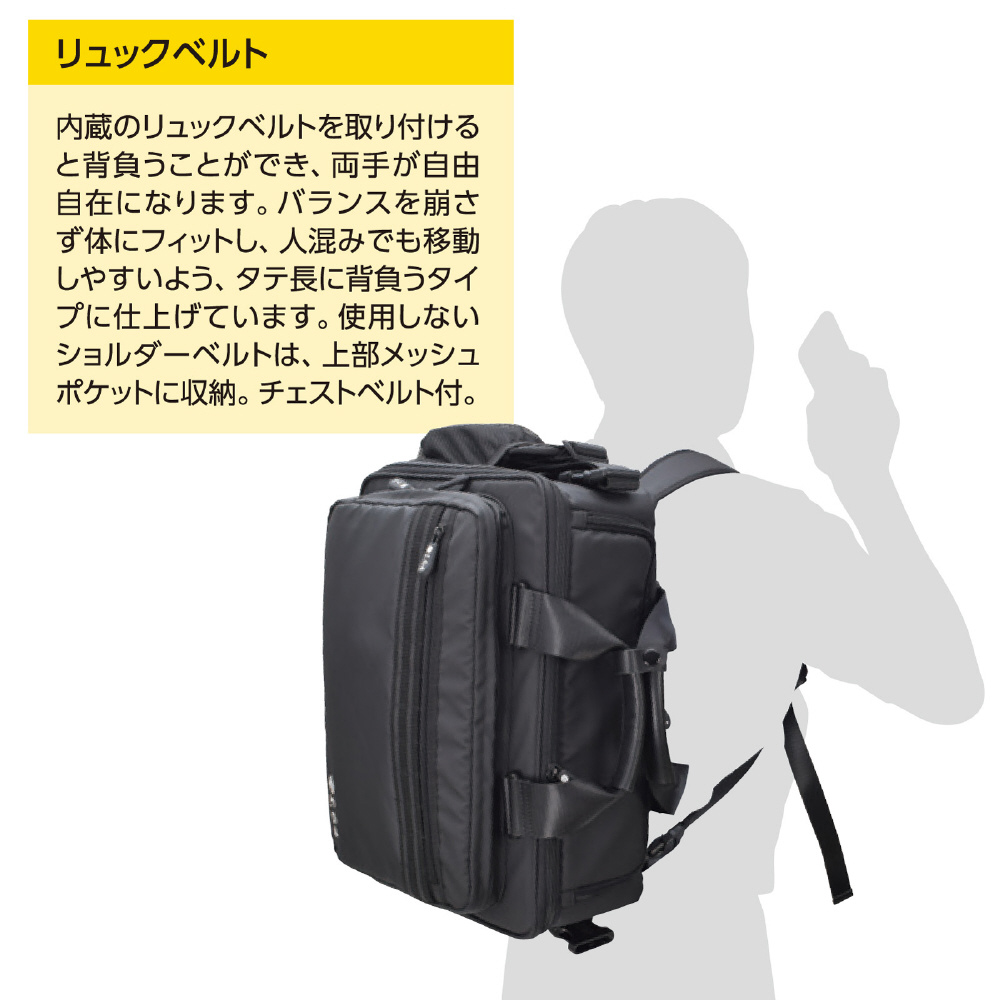 【リュックベルト】背面に収納されたリュックベルトで、人混みでも移動しやすい縦長リュックとして利用可能。バッグの揺れを軽減するチェストベルト付き。