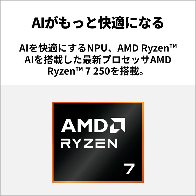 CPU:AMD Ryzen 7 250 プロセッサ 動作周波数:3.3GHz(最大5.1GHz) コア / スレッド数:8コア/ 16スレッド キャッシュメモリ:24MB