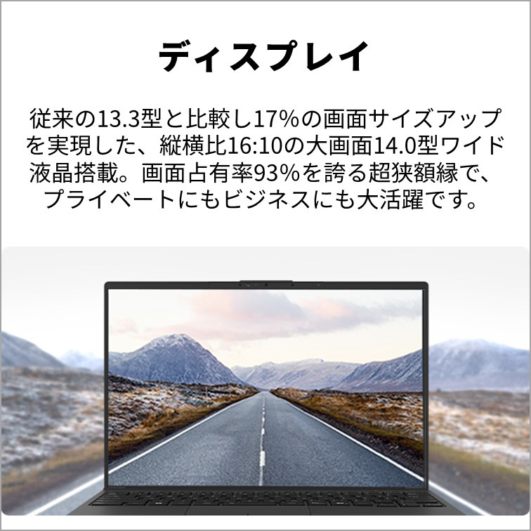 [表示機能] ディスプレイ:ノングレア液晶(WUXGA)、高輝度・高色純度・広視野角 パネルサイズ:14.0型ワイド 解像度/表示色:1920×1200ドット/1677万色 HDMI出力:最大4096×2160ドット/1677万色 [SSD]約512GB SSD(PCIe Gen4) [LAN]1000BASE-T/100BASE-TX/10BASE-T準拠 [無線LAN]Wi-Fi 7(5.76Gbps)対応、 IEEE802.11be/ax/ac/a/b/g/n準拠、MU-MIMO対応
