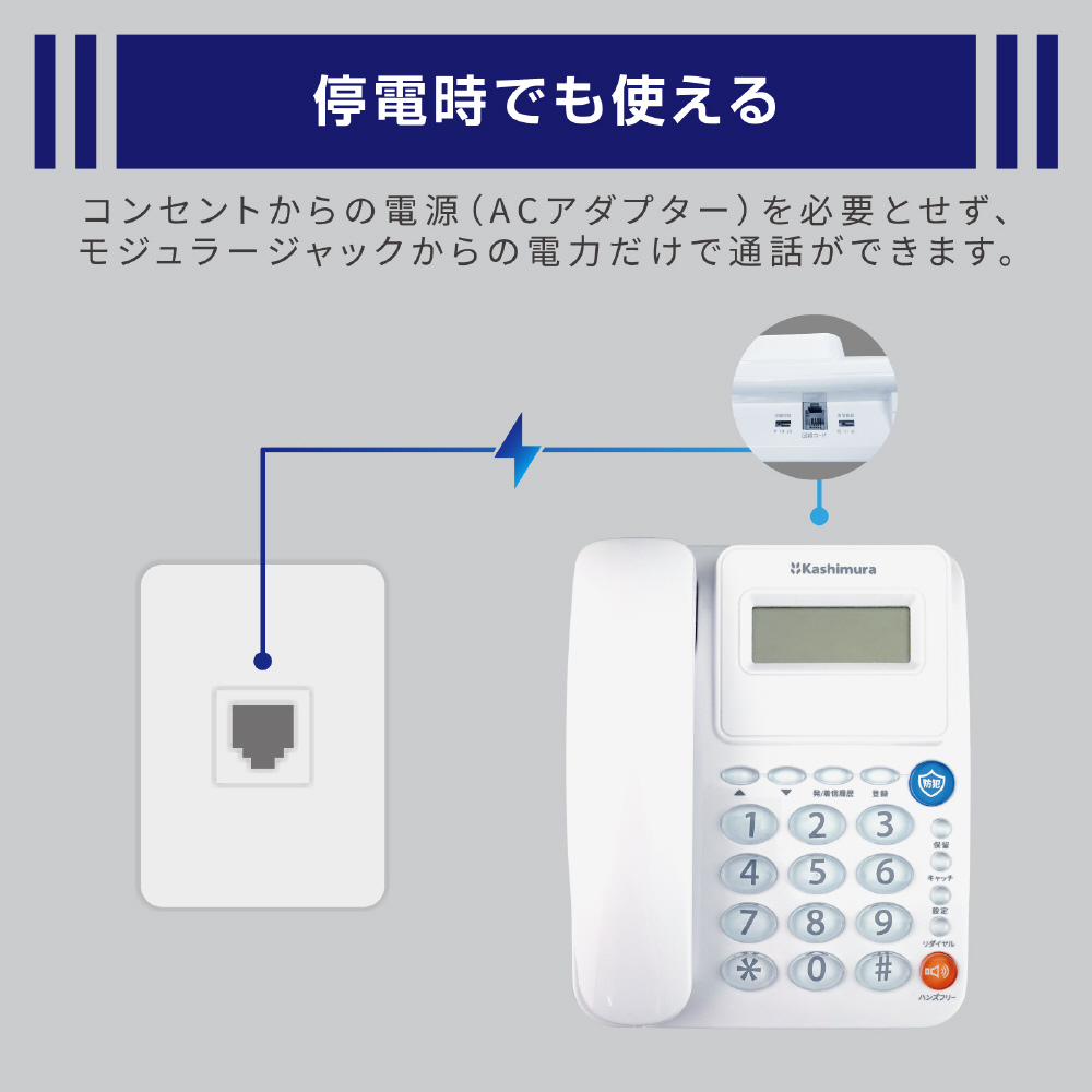 コンセントからの電源(ACアダプター)を必要とせず、モジュラージャックからの電力だけで通話ができます。