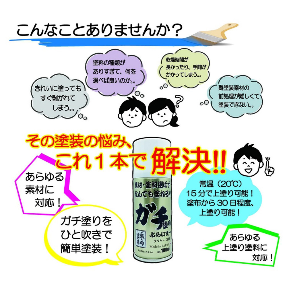あらゆる素材に対応!ガチ塗りをひと吹きで簡単塗装!常温(20℃)15分で上塗り可能!上塗り塗料との相性も良く、塗料選びも好きな色を選ぶだけ。