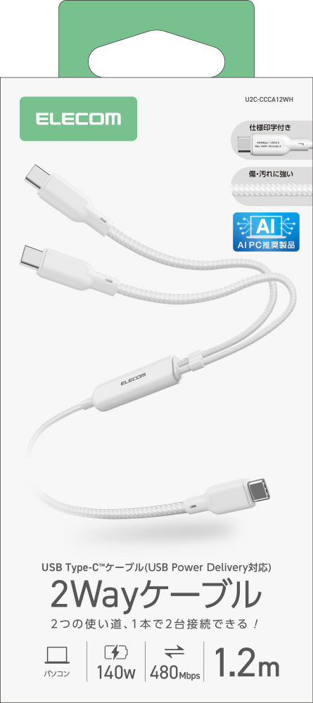 USB-C ⇔ USB-Cx2 分岐ケーブル [充電 /転送 /1.2m /PD140W /USB2.0] ホワイト U2C-CCCA12WH [USB-C ⇔ USB-C]