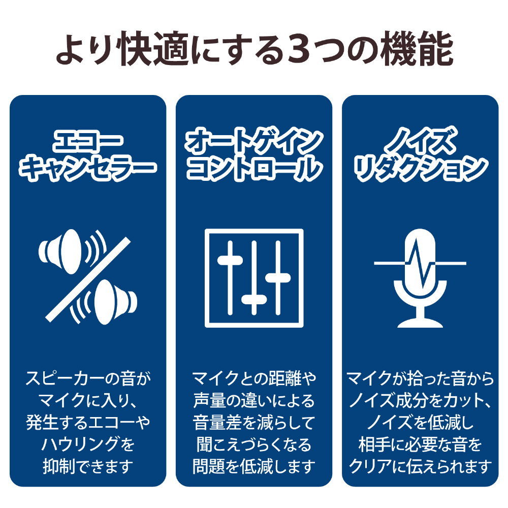 エコーキャンセラー機能により、スピーカーからの音をマイクが拾ってしまうことで生じるエコーやハウリングを抑制します。