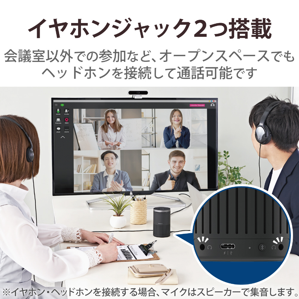 φ3.5mmステレオミニジャックを2つ搭載。ヘッドセットを接続すれば、オフィスで複数人がWeb会議に参加する際も、周囲に聞かれず通話可能です。