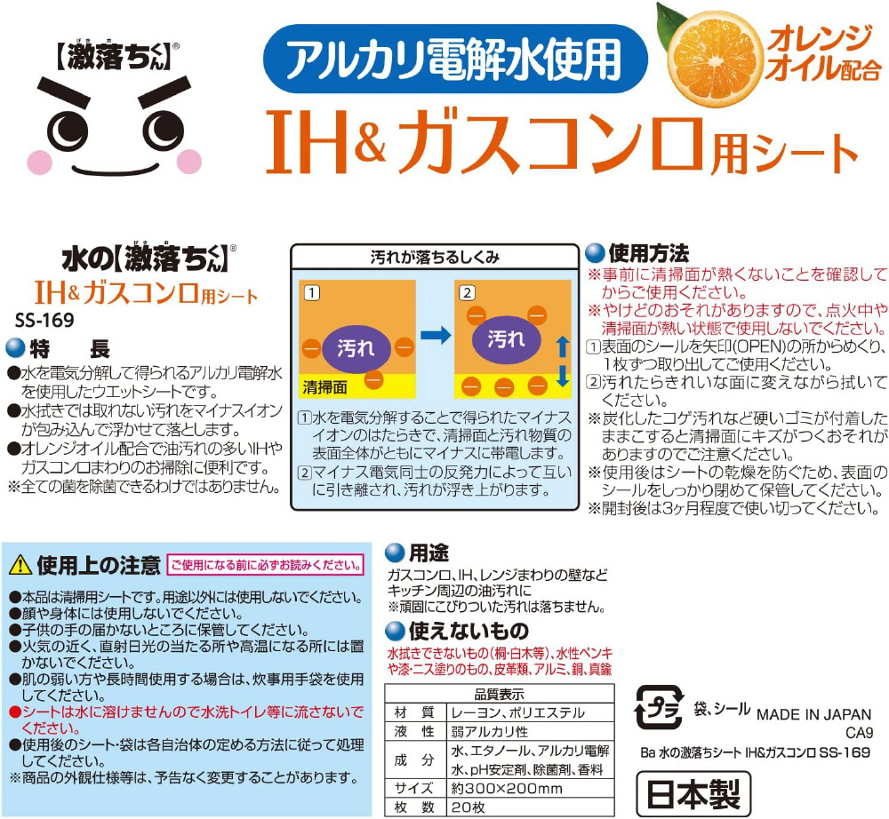 水拭きでは取れない油汚れなどの酸性汚れをマイナスイオンが包み込んで浮かせて落とします。オレンジオイル配合で油汚れの多いIHやガスコンロまわりのお掃除に便利です。※全ての菌を除菌できるわけではありません。 水を電気分解して得られるアルカリ電解水を使用したウエットシートです。