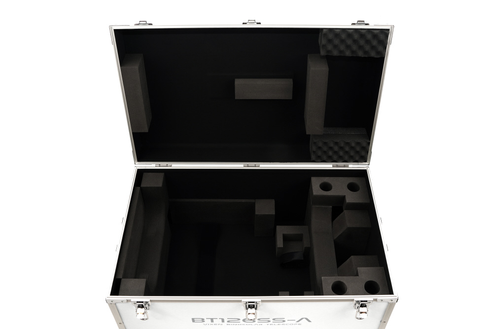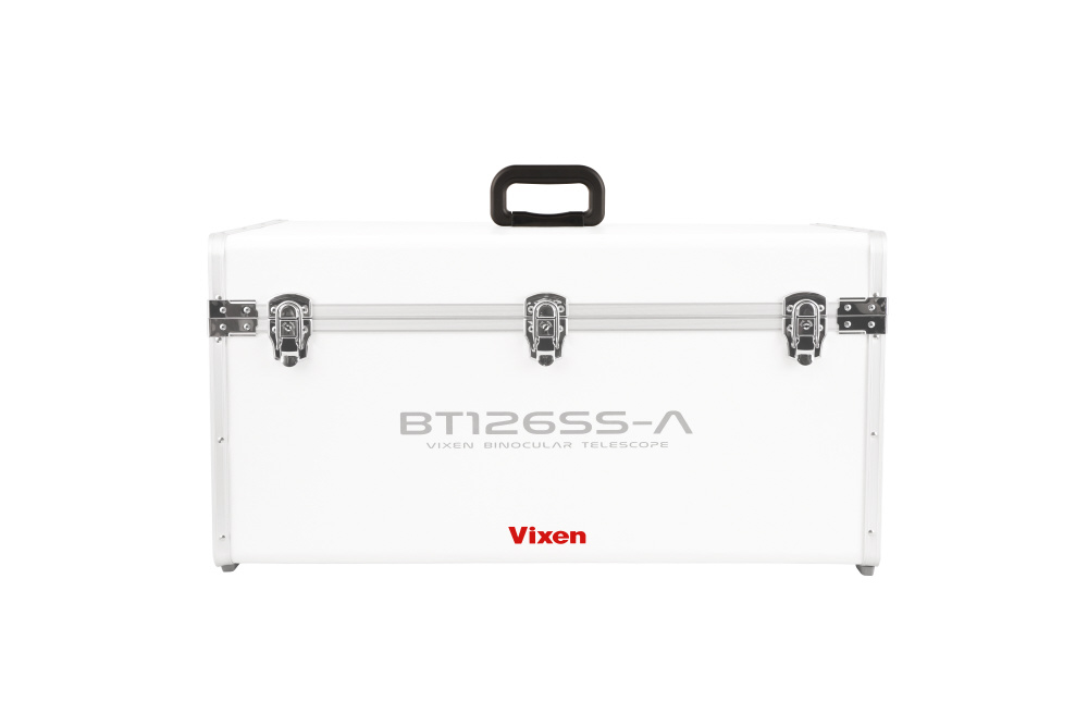 対空双眼鏡BT126SS-A、HF2経緯台やファインダー、接眼レンズまでをまとめて収納できる軽量ケースです。素材には、軽量かつ丈夫で耐水性にも優れた「プラパールR」を採用。従来の当社アルミケースより約2.2kgも軽量でありながら、収納力は格段にアップ。その上ケースのサイズ(体積)はほとんど変わらないスマートさを実現しました。このケース一つで、観察場所への持ち運びがこれまでになく快適に。大切な機材をしっかりと守り、あなたの天文ライフをさらに軽快にサポートします。● 驚きの収納力で、準備も撤収もスピーディーに:双眼鏡本体、HF2経緯台、ファインダー、接眼レンズ。これまで別々に持ち運ぶ必要があった機材一式を、このケース一つにまとめて収納できます。内部の緩衝材は、機材の出し入れのしやすさとスペース効率を追求し、レイアウトを最適化。収納力は格段にアップしながらも、ケースのサイズはほとんど変わりません。輸送中の衝撃から、あなたの大切な機材をしっかりと守ります。●軽量化・優れた可搬性:双眼鏡本体だけを収納した場合、総重量は従来より2.2kg軽くなります。さらに、経緯台やファインダー、接眼レンズ2本を収納しても、重量増はわずか約2.1kg※に抑えられます。天面(フタ)と左右側面に合計3つのハンドルを設け、持ちやすく。車への積み下ろしや観測場所までの運搬を強力にサポートします。※機材収納時重量:従来品:18.7kg(収納物:鏡筒10.5kg/ケース8.2kg)新製品:20.85kg(収納物:鏡筒10.5kg/ 経緯台3.4kg/ファインダー一式0.64kg/SLV20mm×2本 0.31kg/ケース6.0kg)・軽量・高剛性・水にも強い「プラパールR」素材・軽量で耐久性に優れるPP系新素材・プラパールR※1を採用しています。従来、アルミケースでは立体で6面の板を組合せていましたが、曲げに優れたプラパールRの特性を活かし、成型を工夫することで2ピース化。これにより従来比約36%の軽量化に成功しました※2。