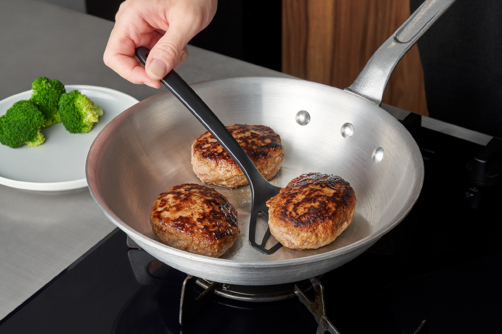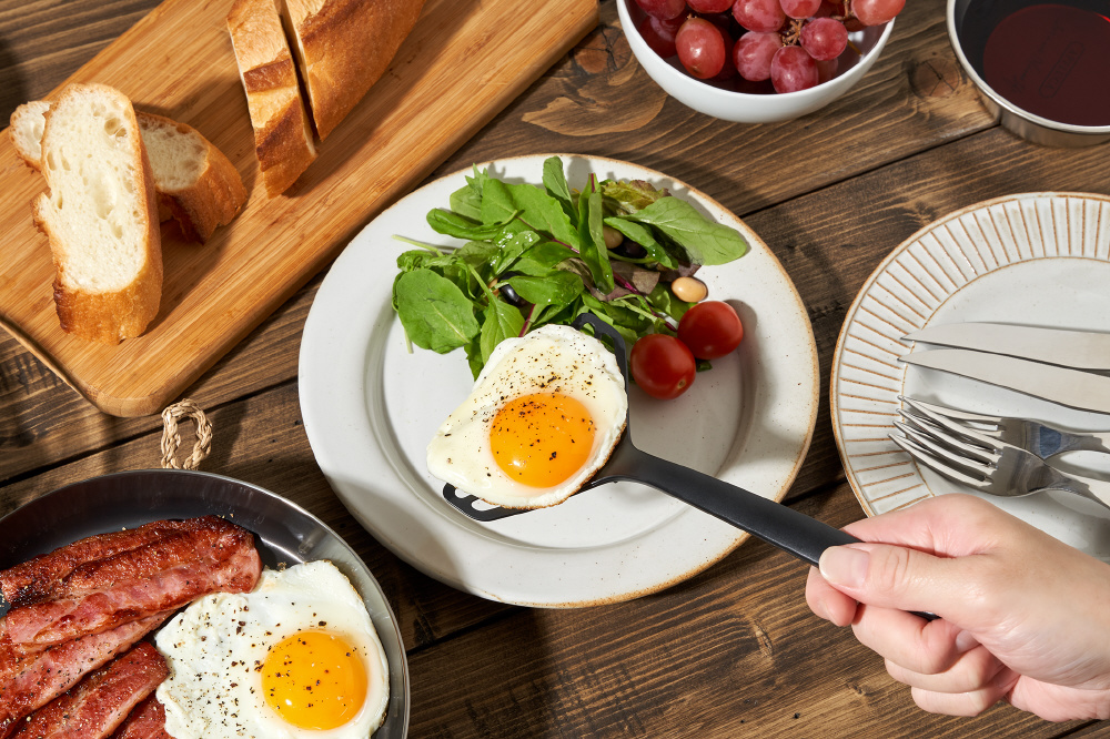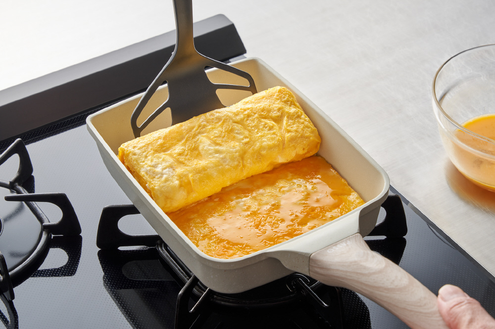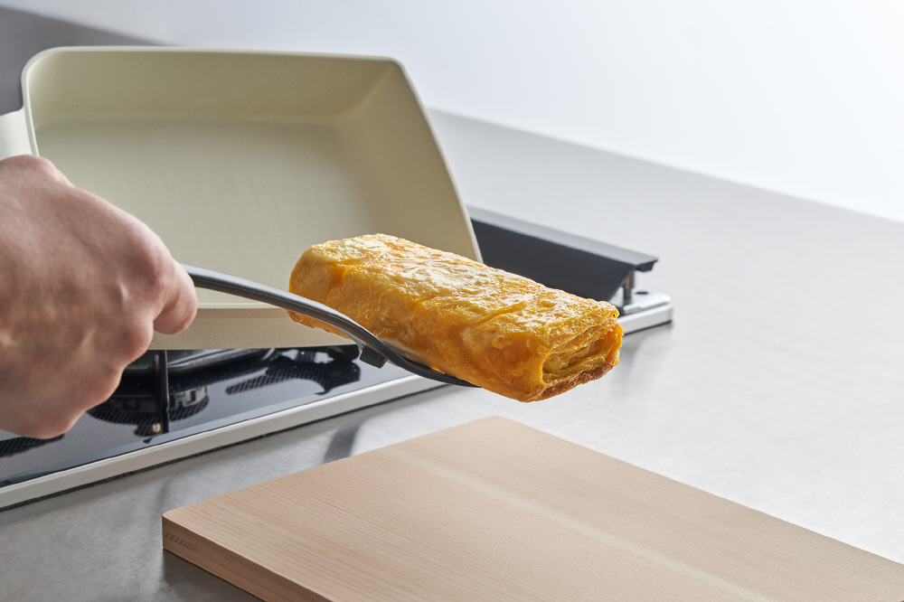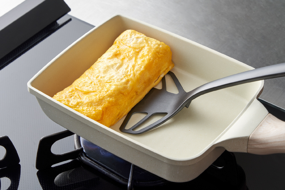 薄くて幅の広いヘッドだから、食材の下にスッと入り、返しやすいのできれいに巻けます。大きな卵焼きもラクラク。