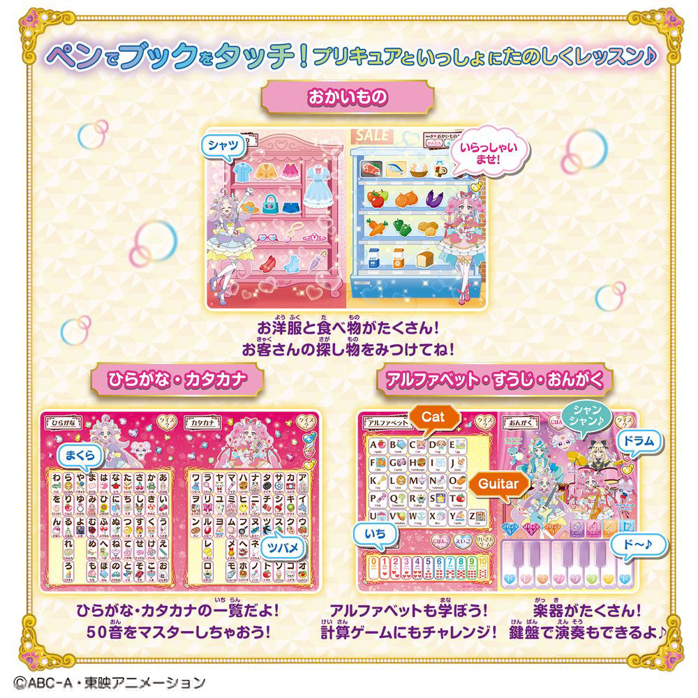 探偵ゲームや50音、数字や音楽など、プリキュアと楽しく学べるレッスンが盛り沢山の商品です。