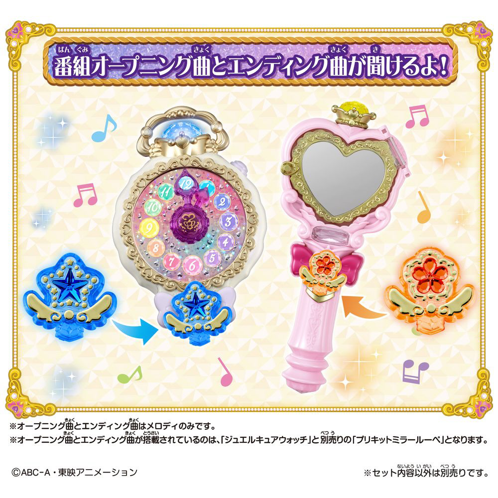別売の「くるっと変身! ジュエルキュアウォッチ」と「のぞいて見つめてジュエルで浄化♪ プリキットミラールーペ」にセットすると、