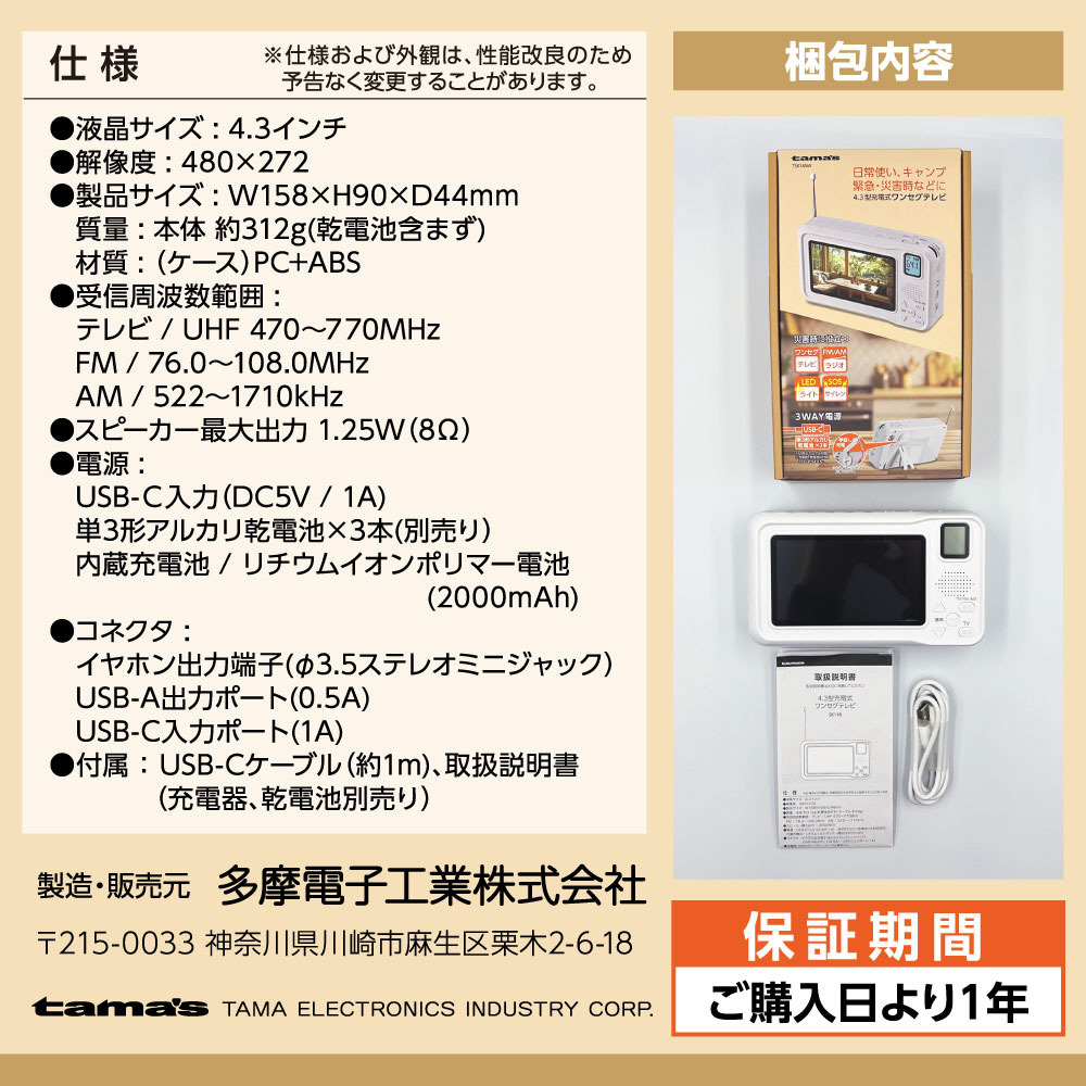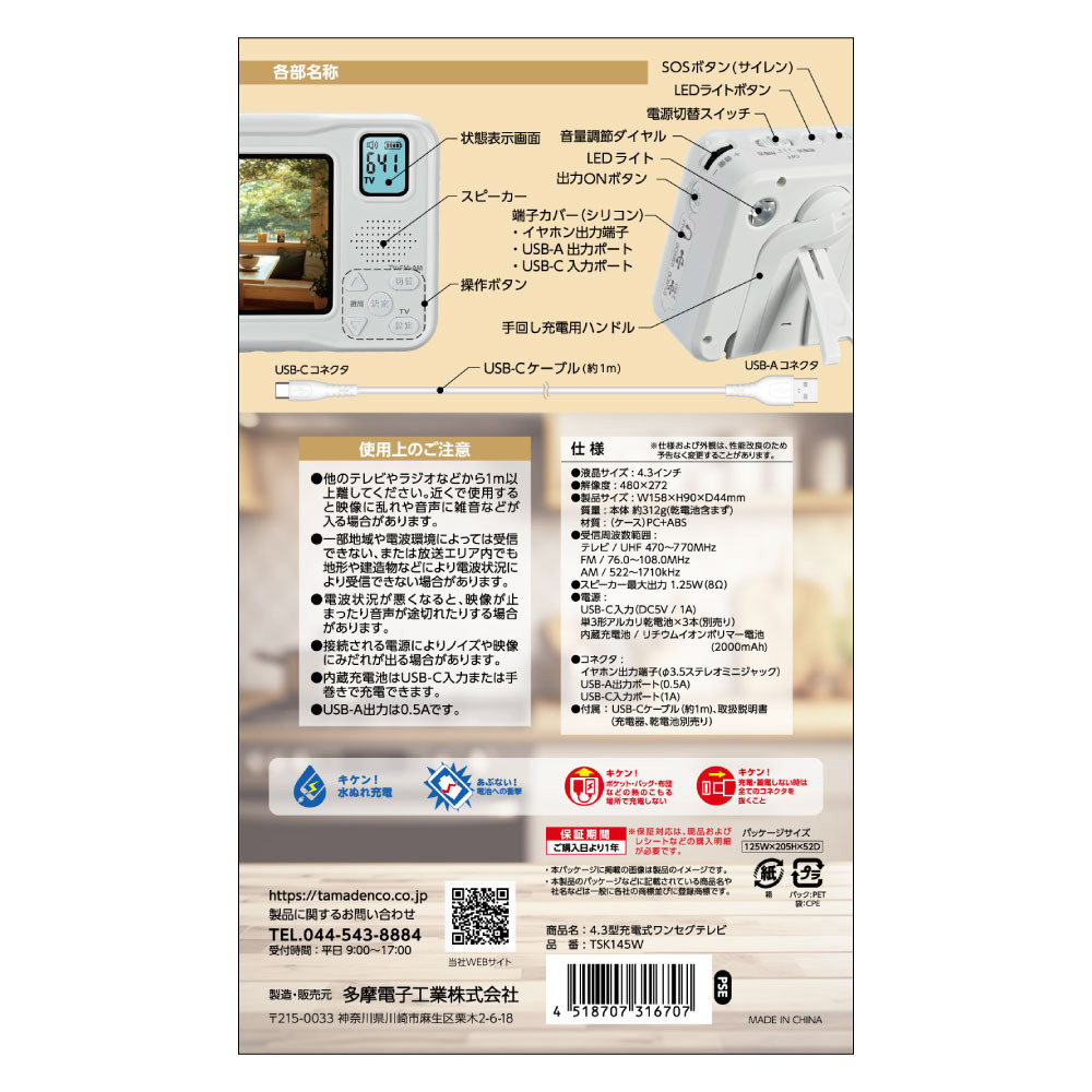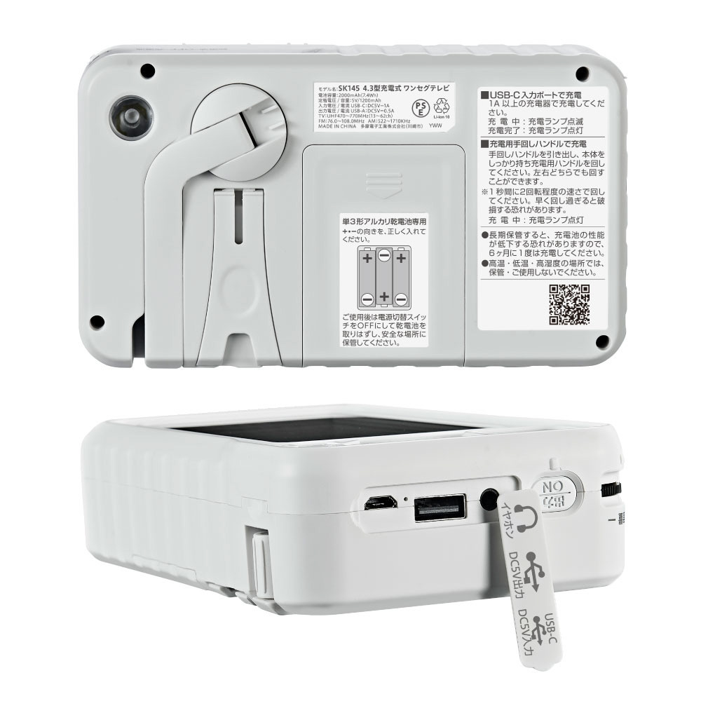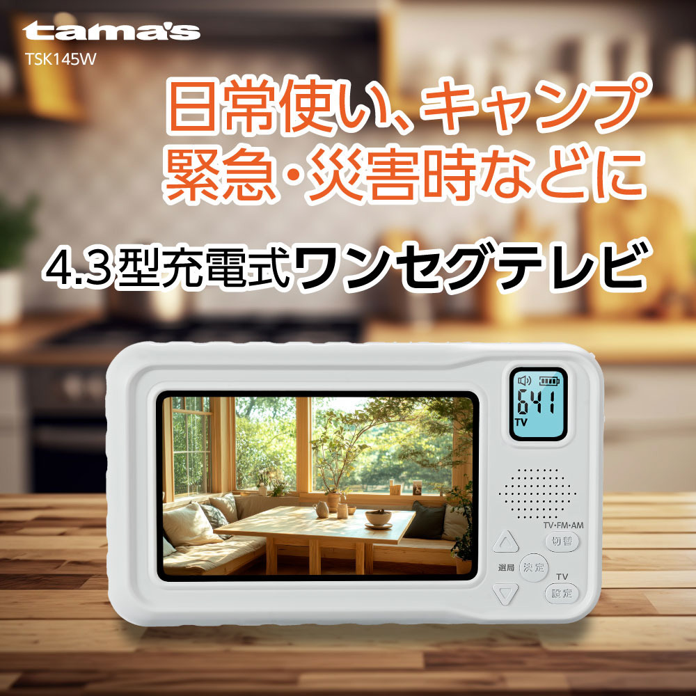多機能4.3型 充電式ワンセグテレビ TSK145W [ワイドFM対応 /AM/FM]