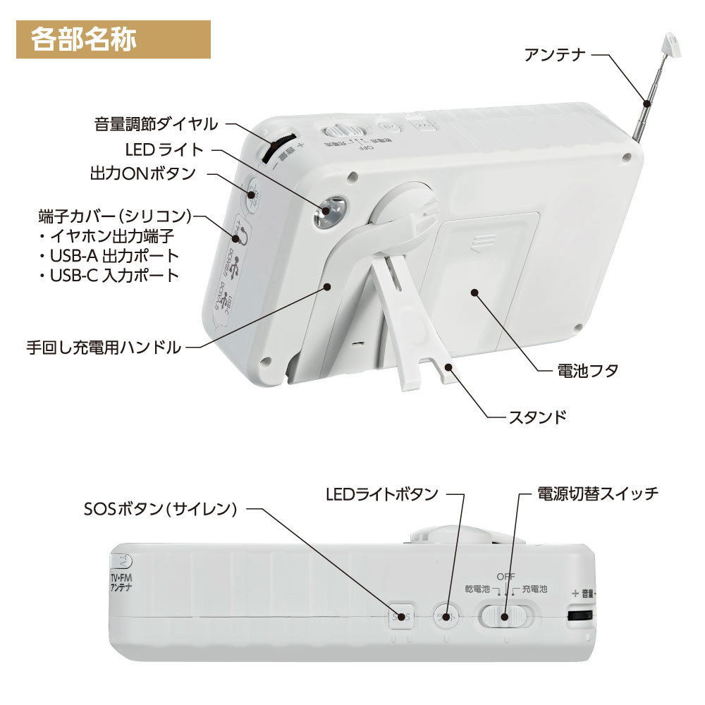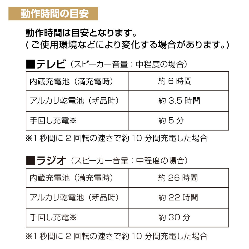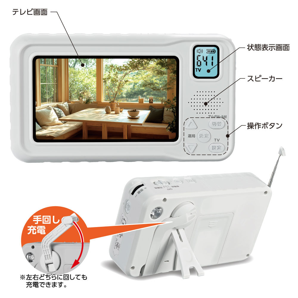 ●内蔵リチウム電池でどこでも視聴可能です。バッテリーが切れても単3形アルカリ乾電池でも視聴できます。 災害時、長期の停電でも手廻し充電で対応できます。