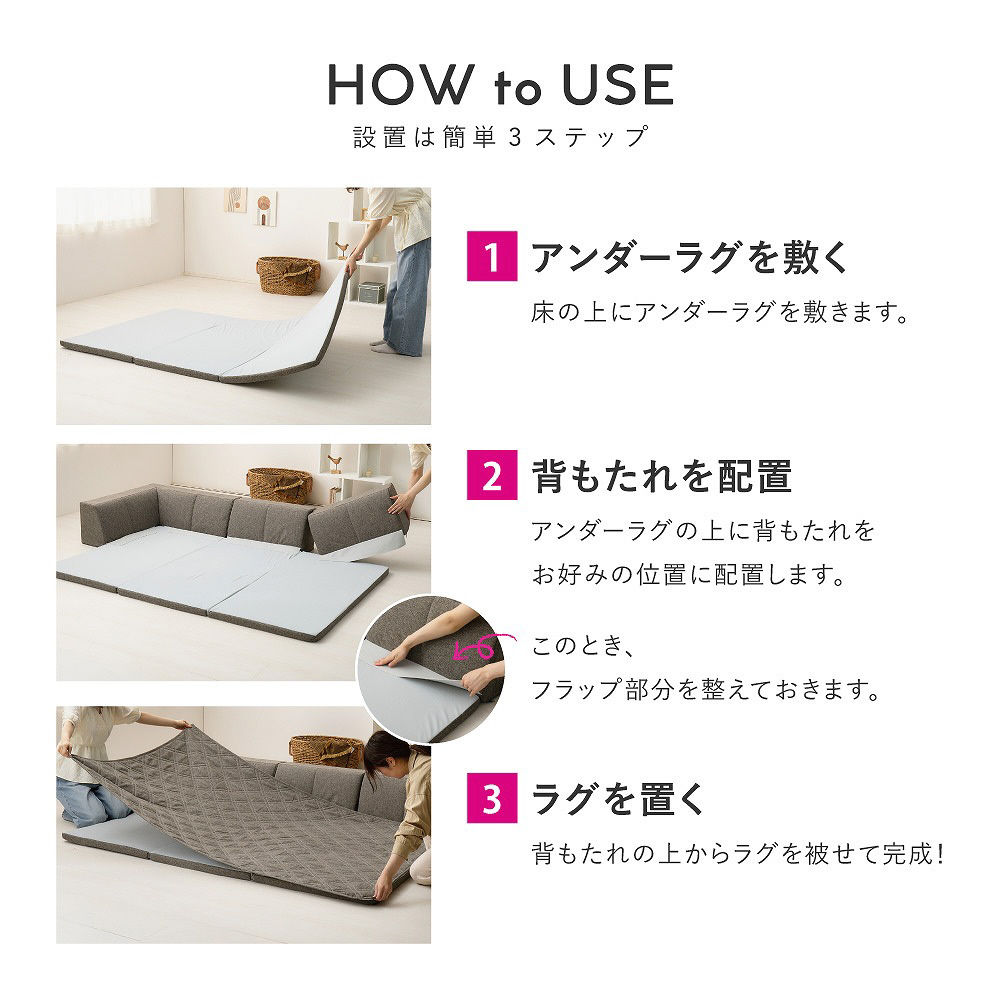 ラグ・アンダーラグ・背もたれクッションを組み合わせて、背もたれの位置を自由にかえられる